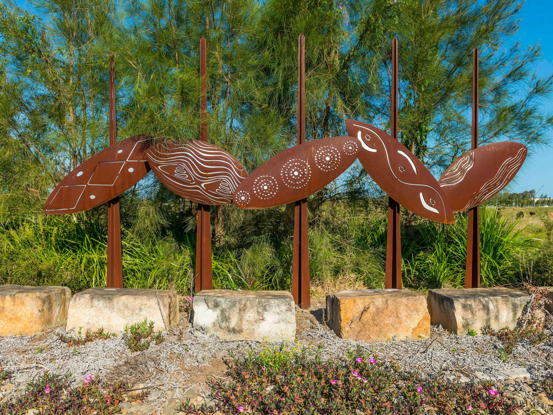 Standing proudly at the entrance to Ballina Byron Gateway Airport, Shields is a powerful public artwork created by Daniel Roberts, Tania Marlowe, and Marcus Ferguson. Crafted from corten steel, the sculptures represent the five camps of the local Ngangbul People — East Ballina, West Ballina, Duck Creek, Broadwater, and Lennox Head.