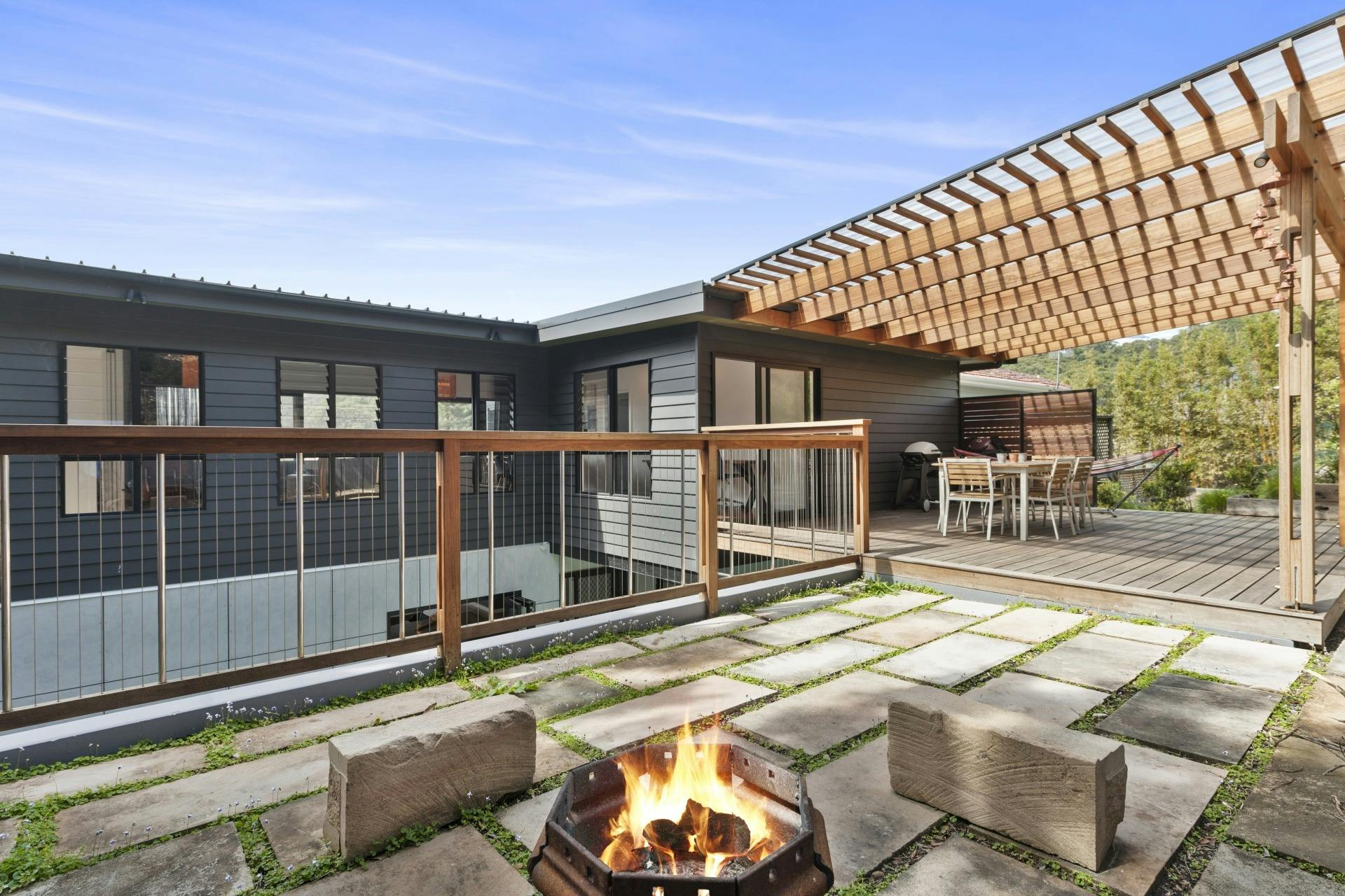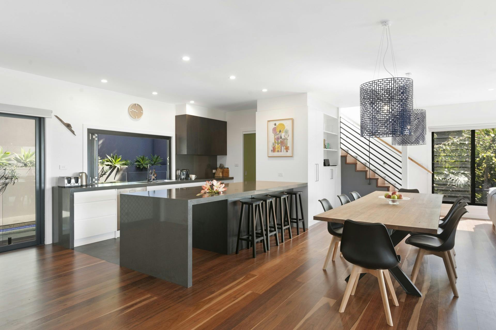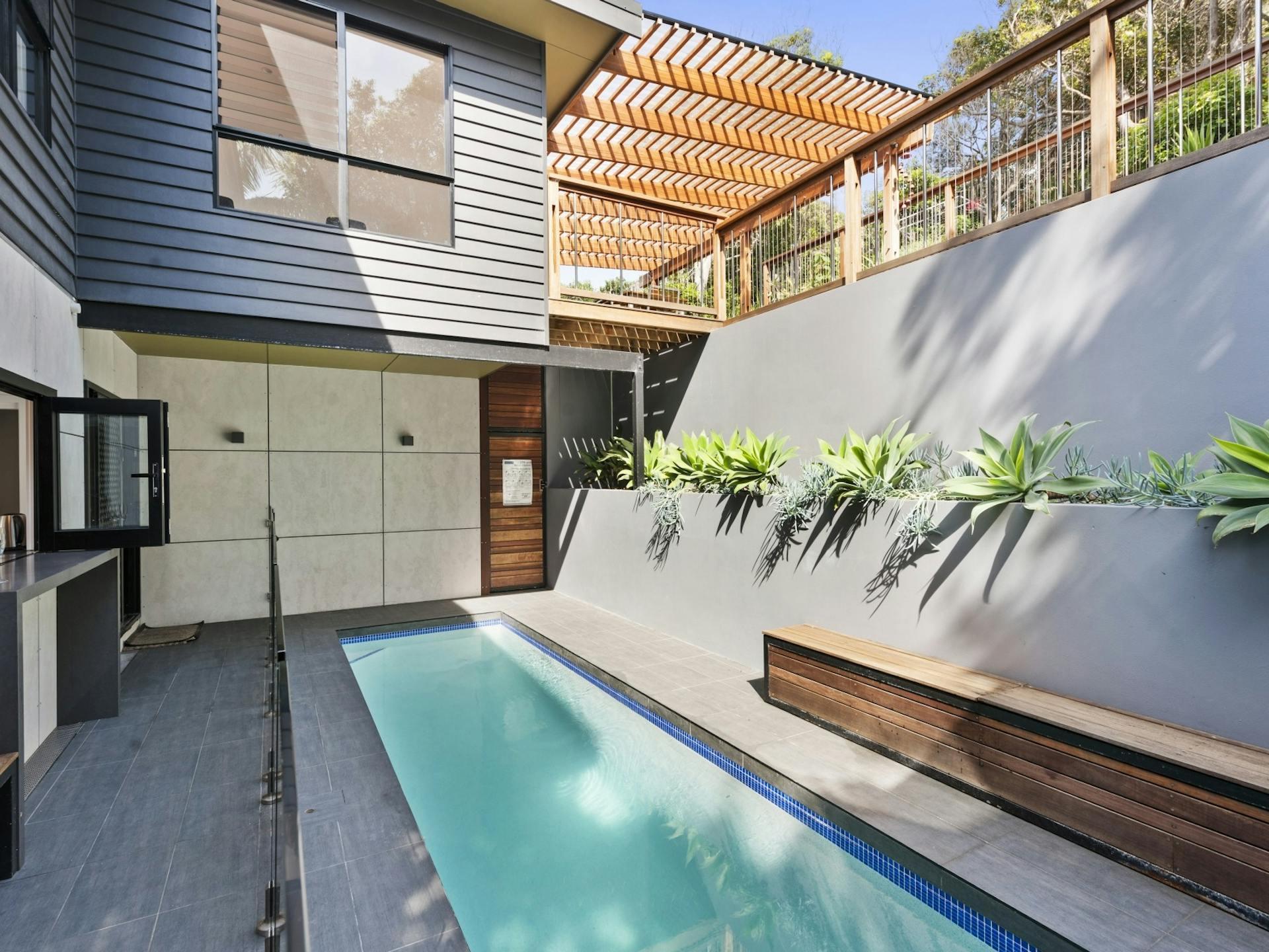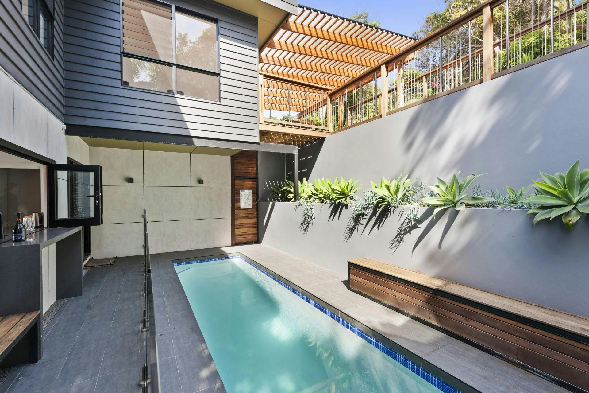 Ideal for a large family or two families to share, this beach haven is equipped with four bedrooms, three bathrooms and two separate living areas. The spacious design layout creates a welcoming atmosphere. The downstairs living area flows seamlessly through to the solar heated lap swimming pool.
