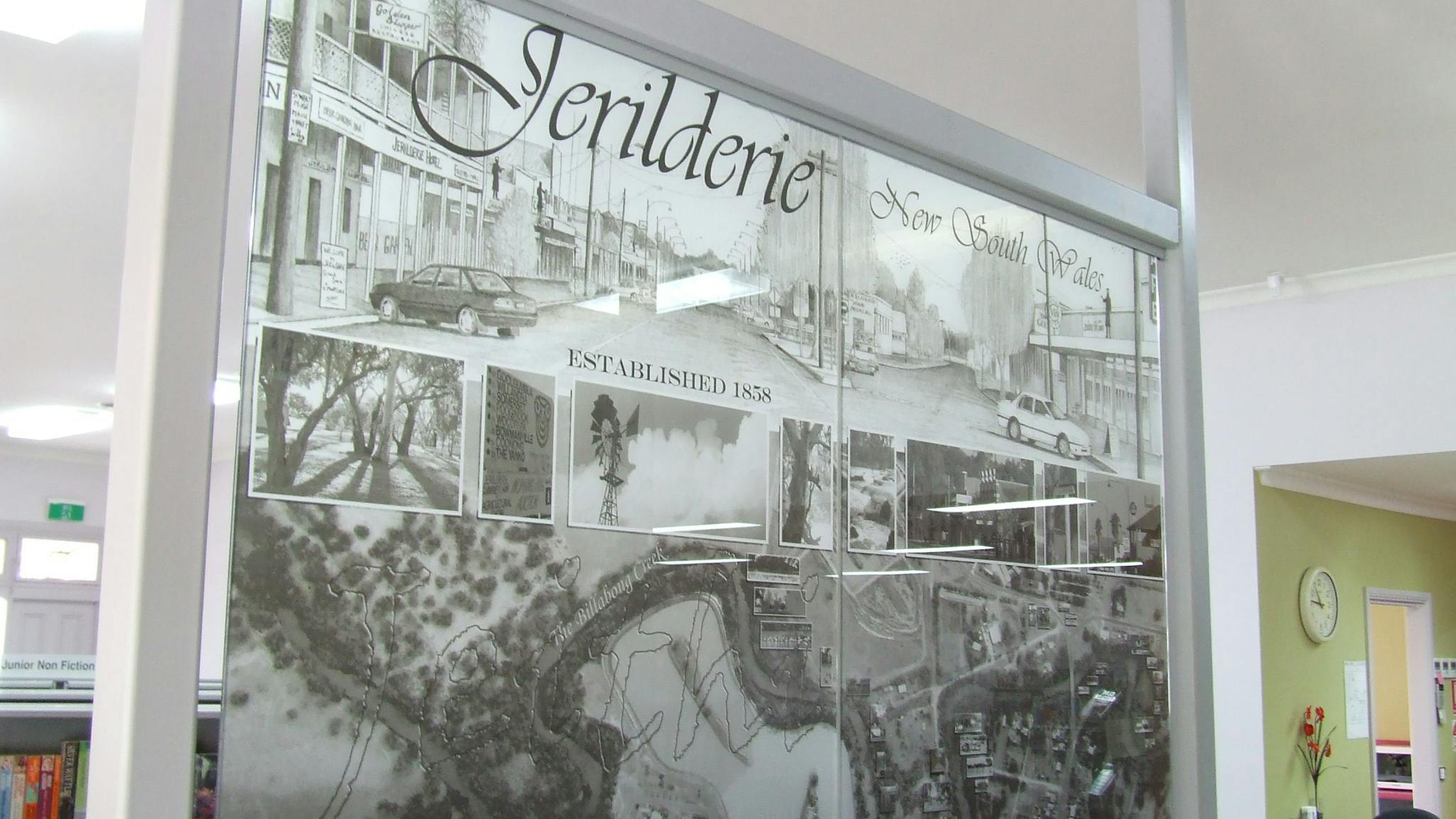 The building is a replica of the original "Banksi" home, which once stood at the site. The glass panels at the entrance to the building illustrate some of Jerilderie's rich history and present-day influences and include photographs.