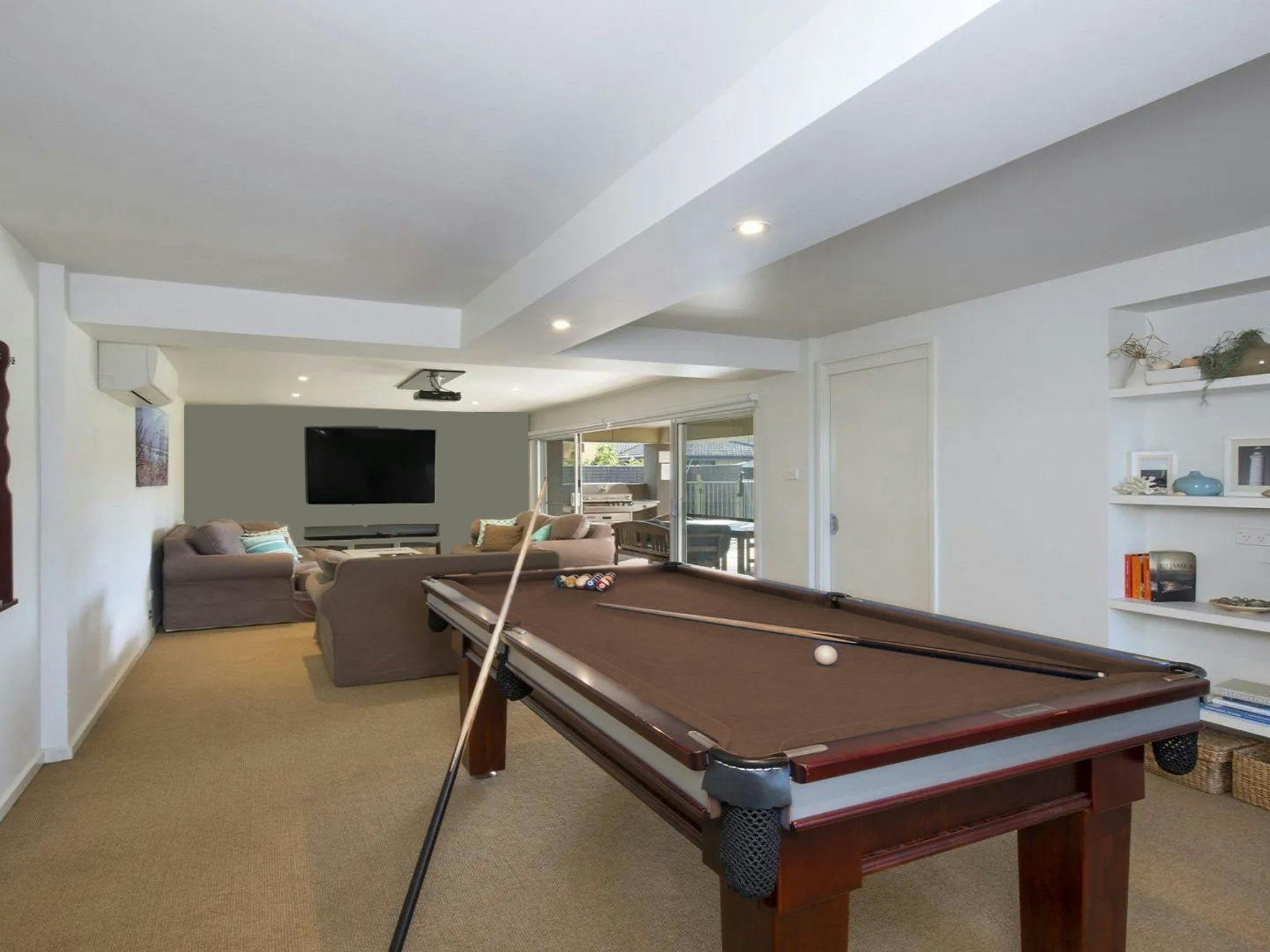 Watch a classic or something new on Netflix on the large projector tv in the media room, which has comfortable couches and a pool table. Sliding doors open onto the undercover courtyard, perfect for the summer barbeque around the sparkling in-ground pool.