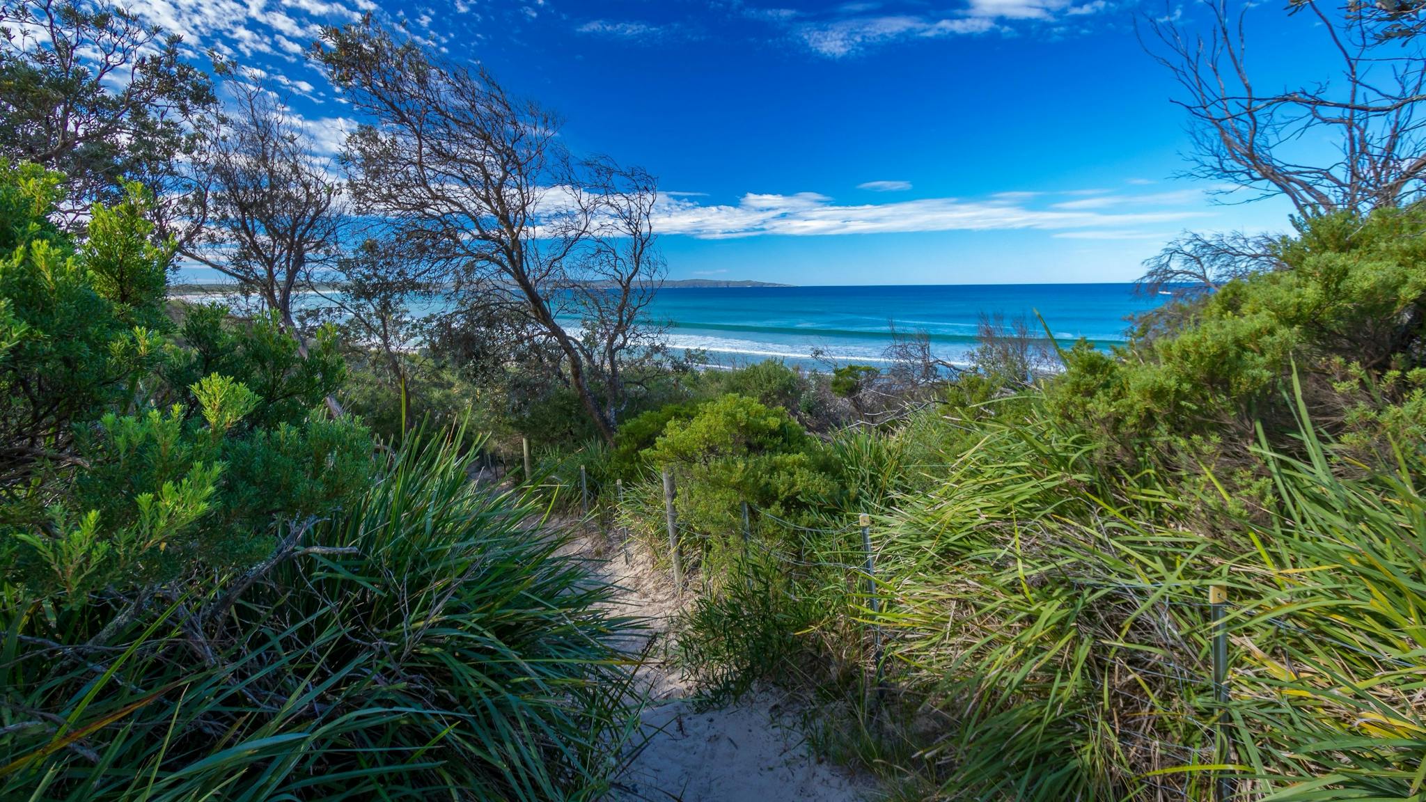 The steep dunes and headland make for great sunrise and sunset viewing. It runs from Booderee National Park in the north to Sussex Inlet in the south, and is separated from St Georges Basin by transgressive sand dunes.