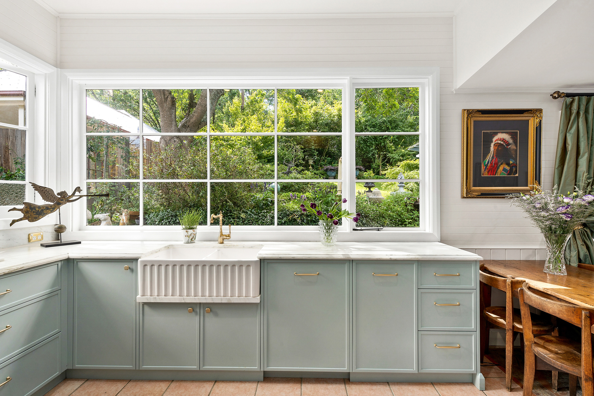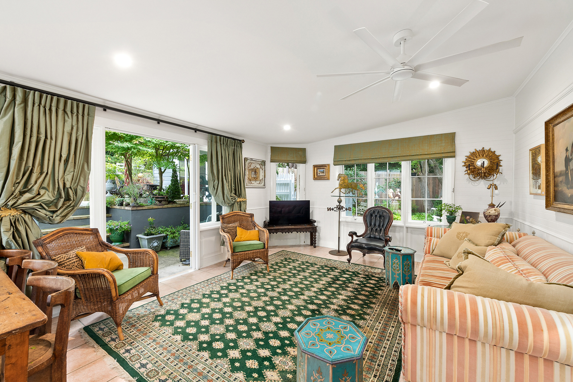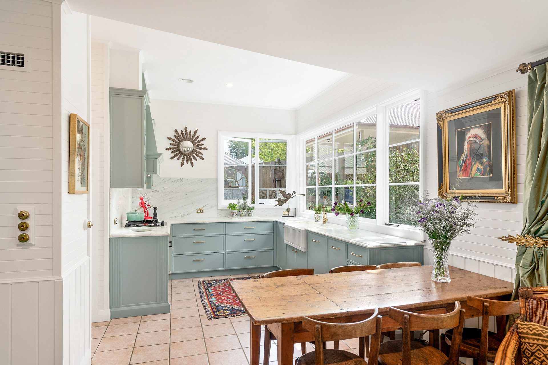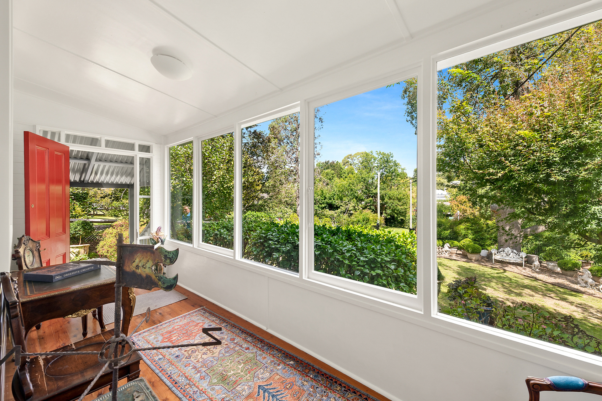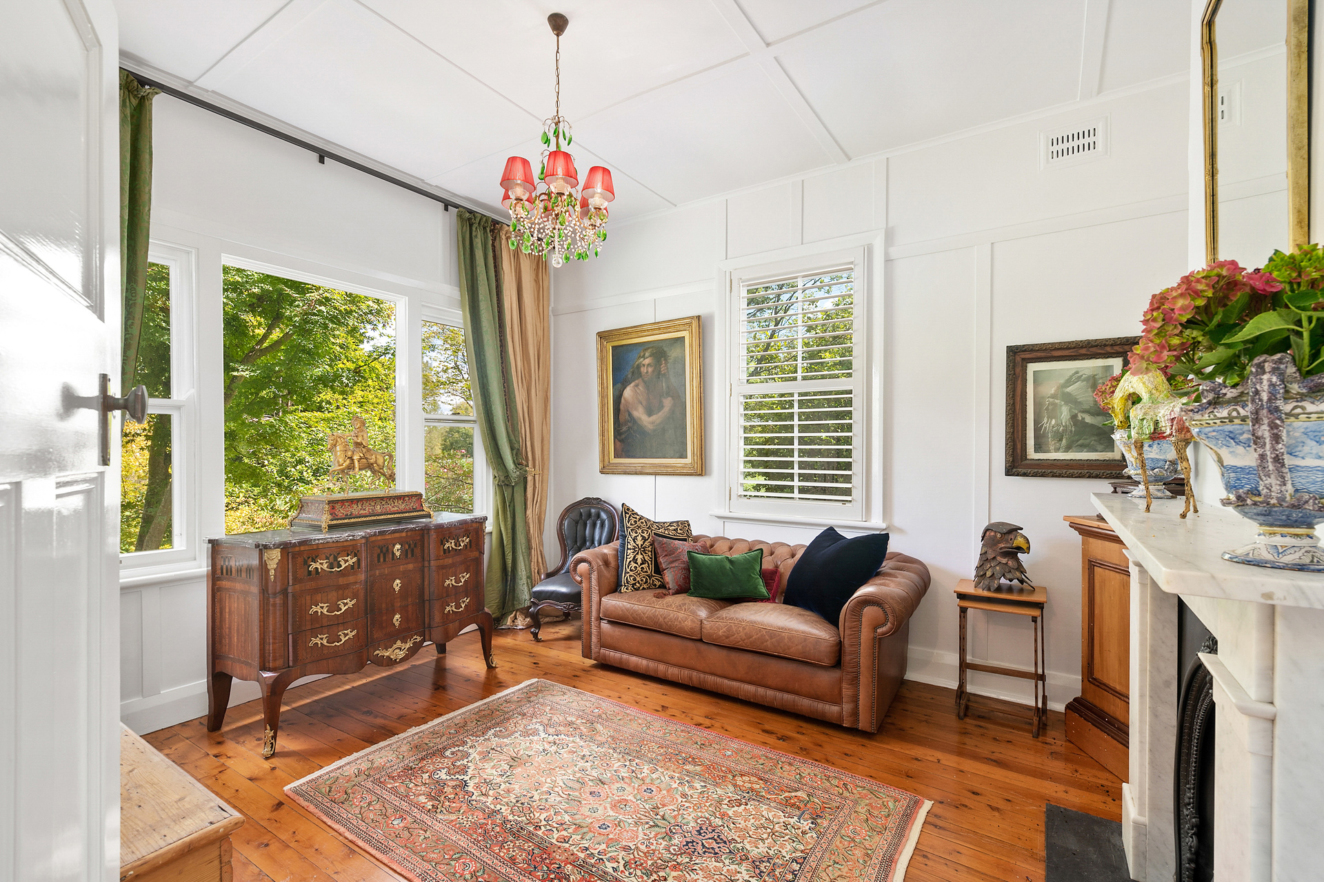 Step through the sun-drenched front sunroom and into a home that has beautifully retained its original features, including high ceilings, timber floorboards, reclaimed antique fireplaces, picture rails, and timber-framed windows that perfectly capture the attractive leafy garden outlooks.