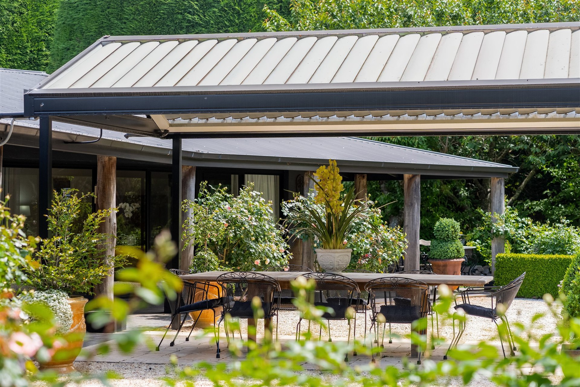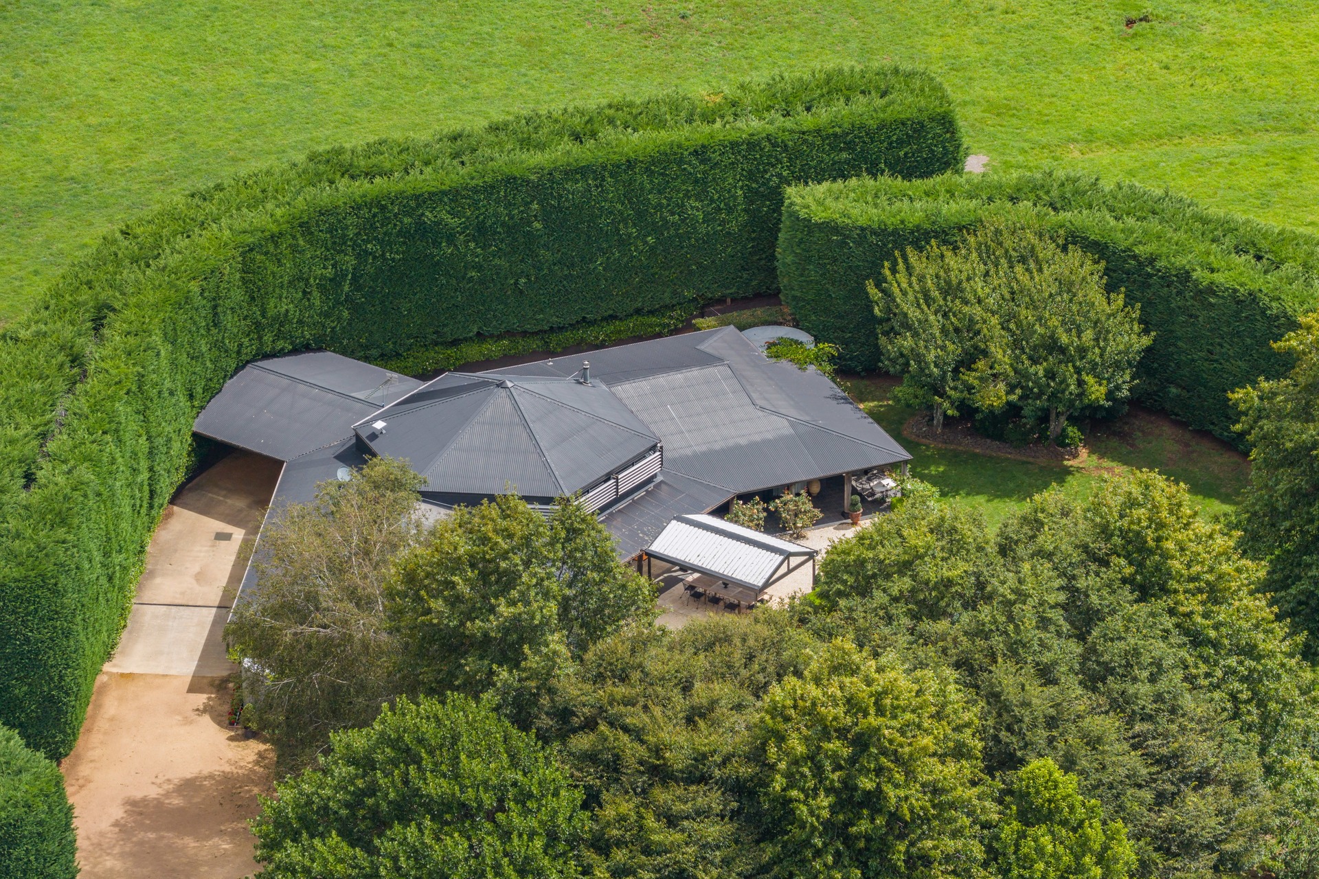 The accommodation is designed for seamless entertaining and supreme comfort, surrounded by meticulously maintained lush house gardens and towering hedges that guarantee absolute privacy and create an enclave of sheltered calm. From the contemporary 4-bedroom main residence and its undercover alfresco dining and lounge area, to the separate deluxe barn retreat with sandstone open fireplace and two ensuite bedrooms, every detail caters to high-end living.