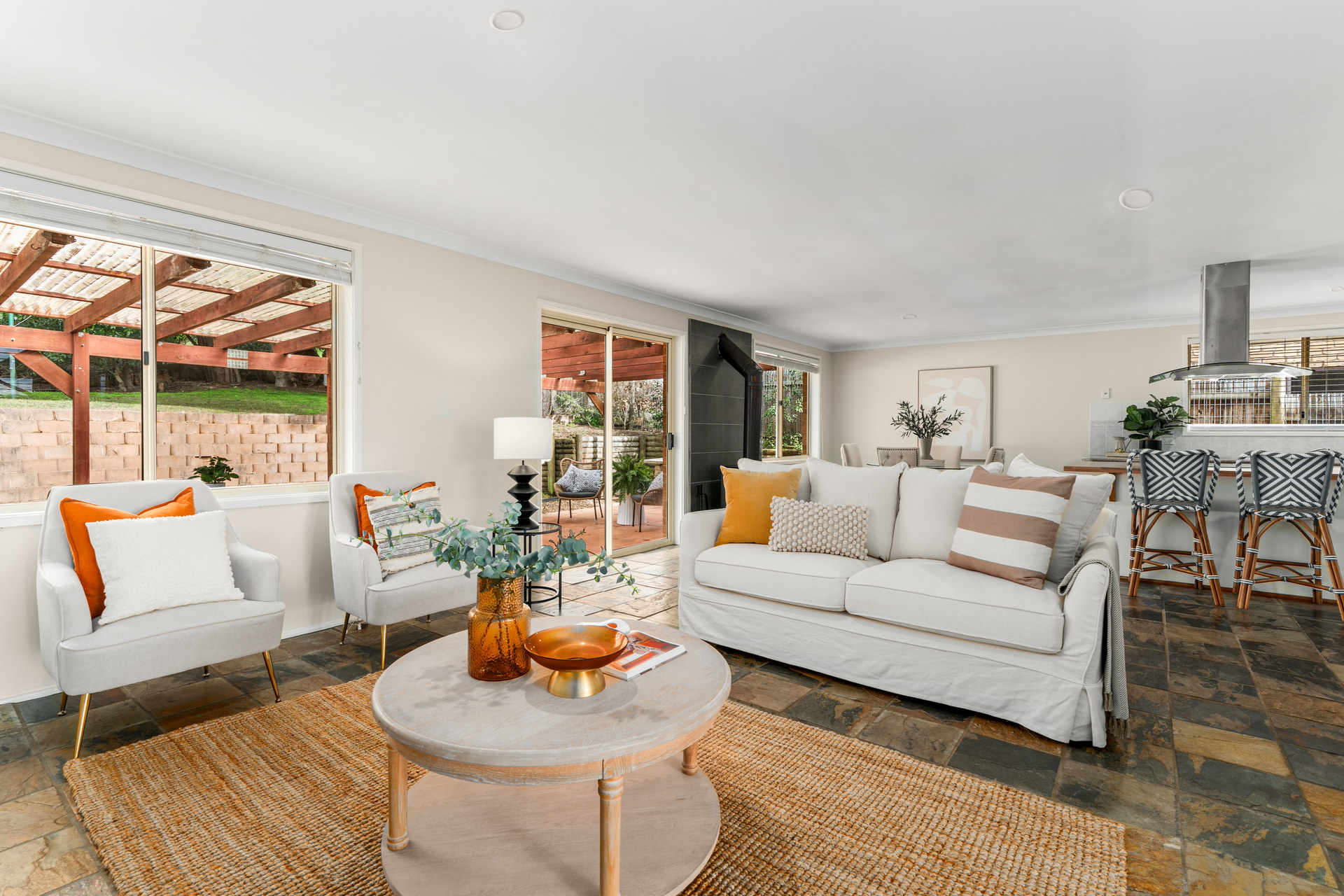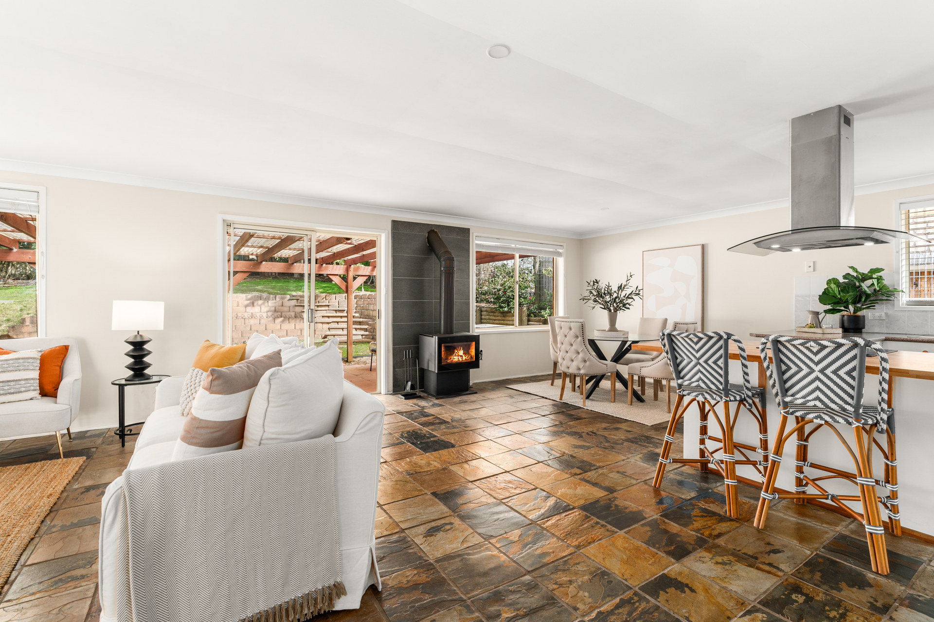 Inviting living spaces: Open plan lounge and dining area bathed in natural light, featuring a slow combustion fireplace for cosy winter evenings.