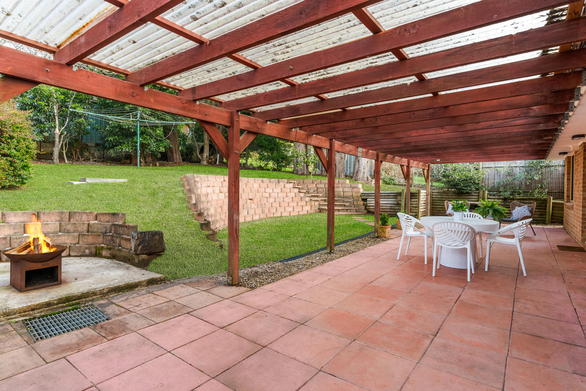 Entertaining haven: Expansive covered alfresco area, complemented by a built-in firepit for year-round gatherings.
