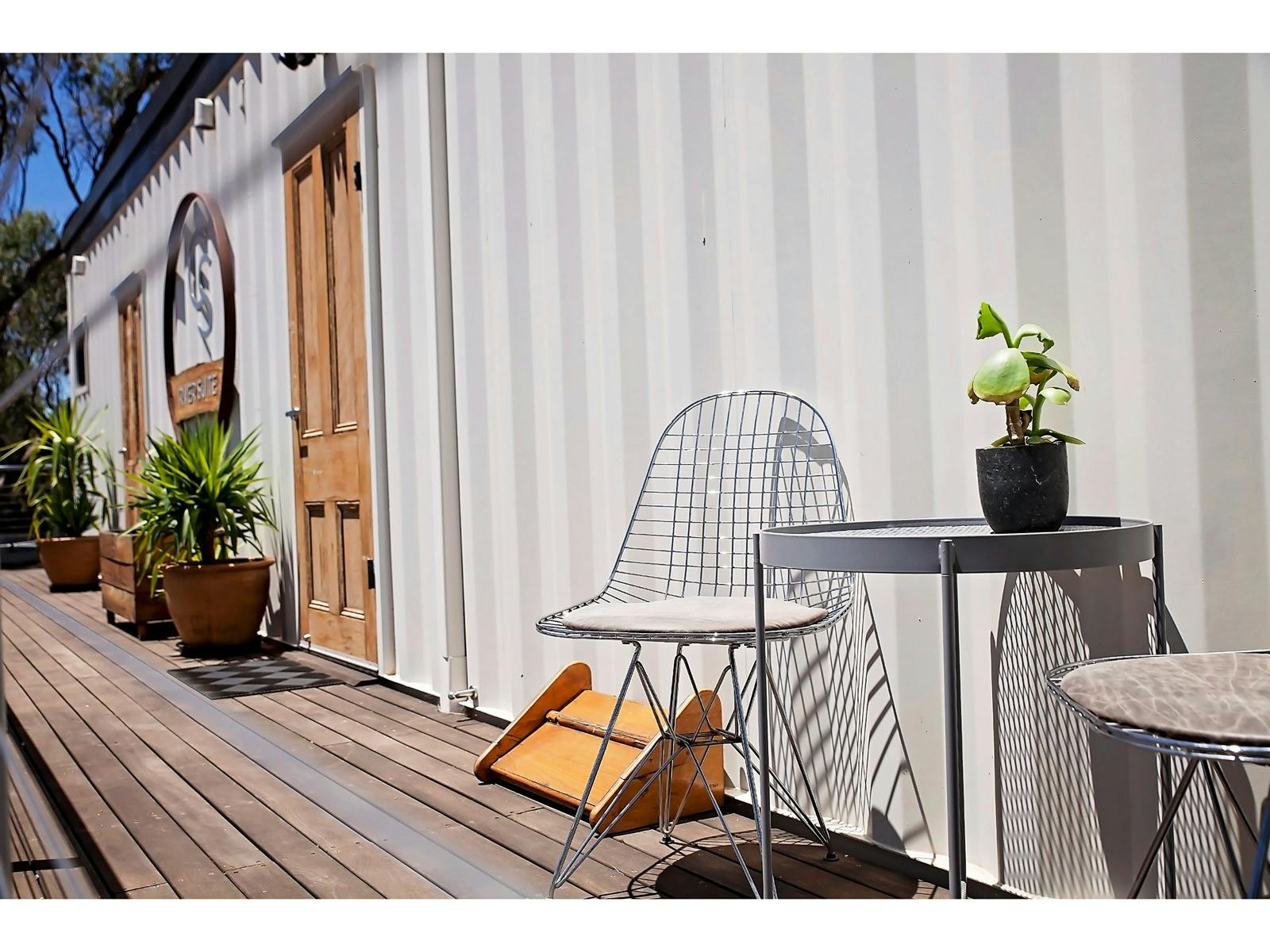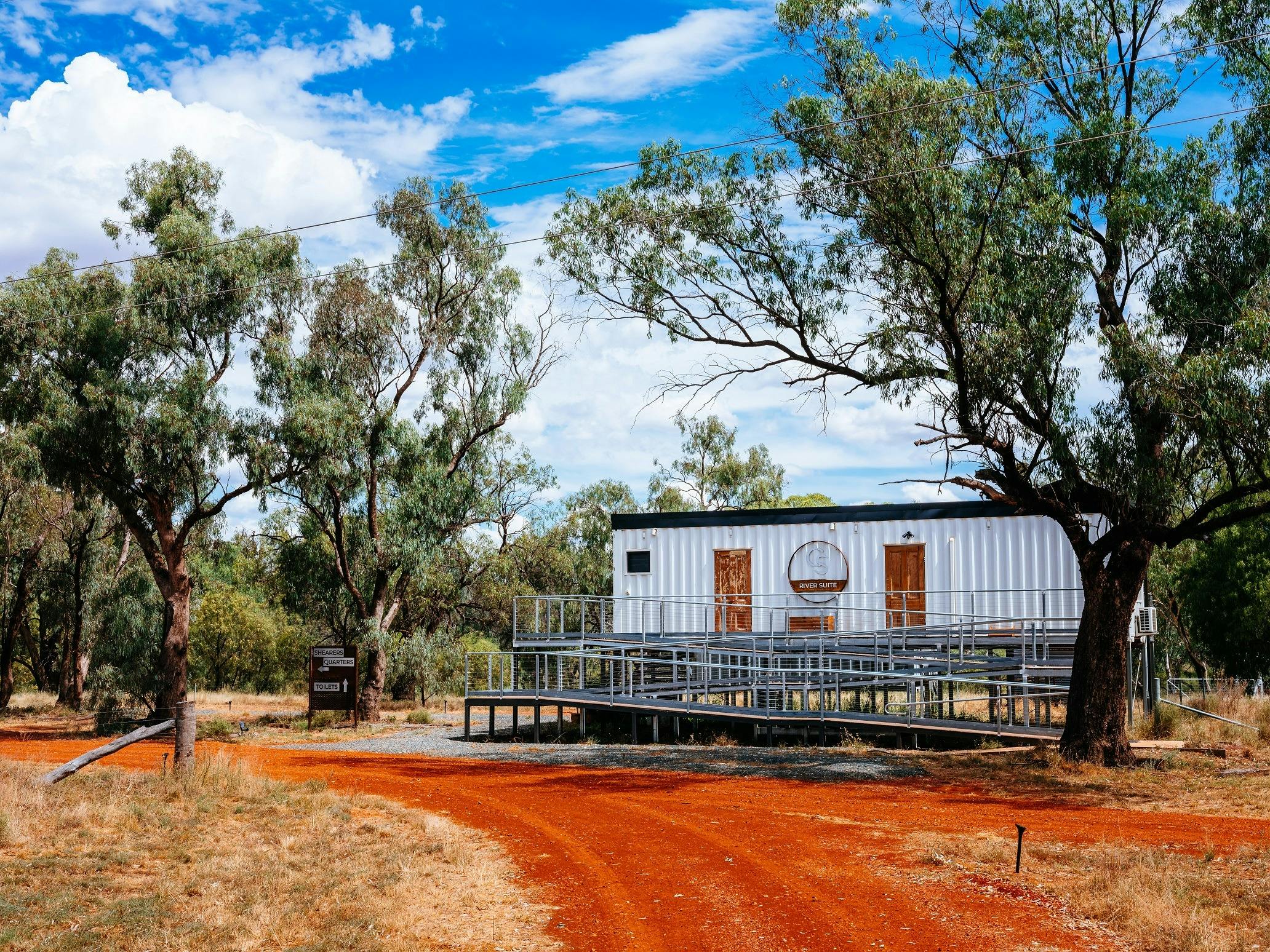 The Sky Suites accommodates up to eight guests (king/twin) in repurposed shipping containers stacked three stories high with private views overlooking a 12-metre mineral pool. The River Suite accommodates a further two guests in an accessible king suite.