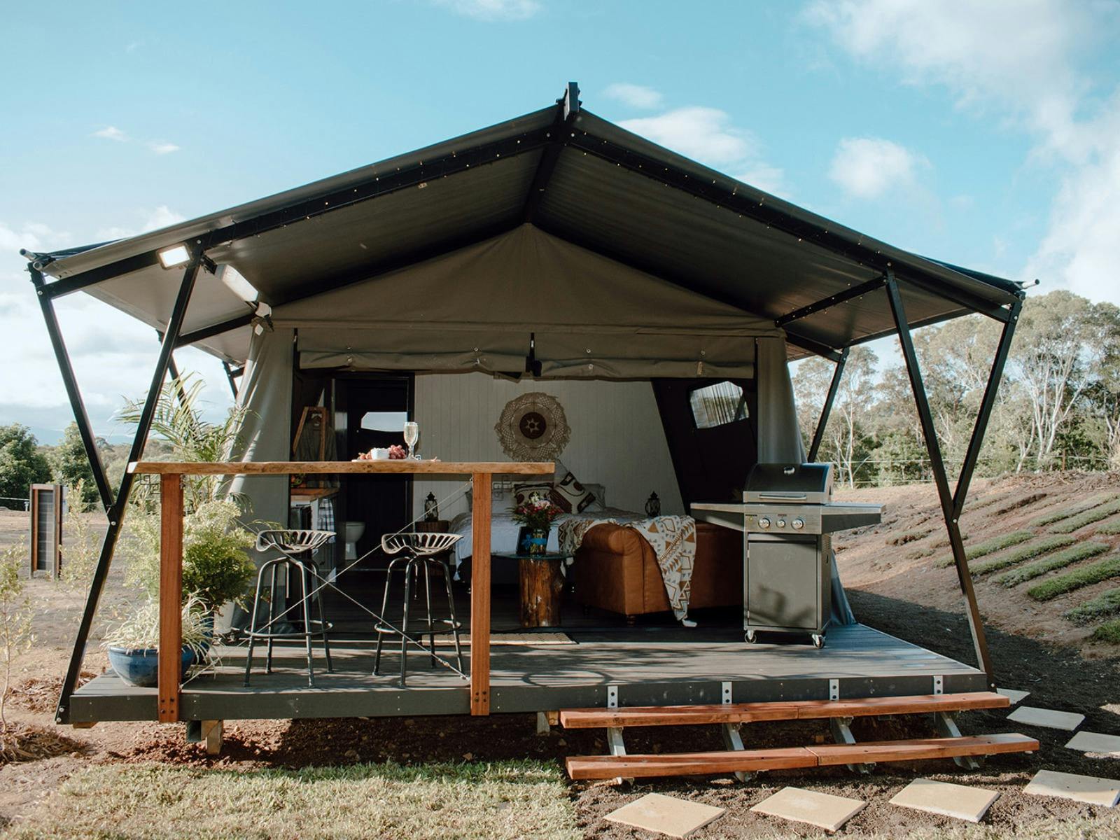 From the moment you arrive, you'll be welcomed with a glass of wine and a selection of locally crafted cheese and chocolate, setting the tone for a memorable stay. The accommodation options are equally extraordinary—choose from a beautifully designed glamping tent, a historic train carriage, or the elegant Ghan carriage, featuring stunning details like a chandelier and an indulgent outdoor bathtub for stargazing. Make your stay even more special by interacting with the friendly farm animals.