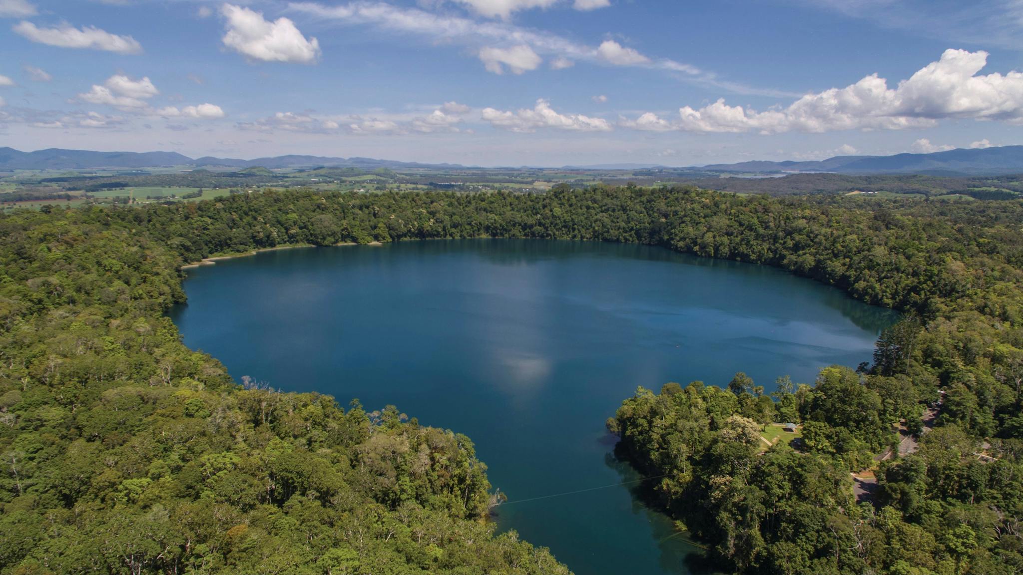 A serene blue lake surrounded by lush tropical rainforest, Lake Eacham is part of Crater Lakes National Park.