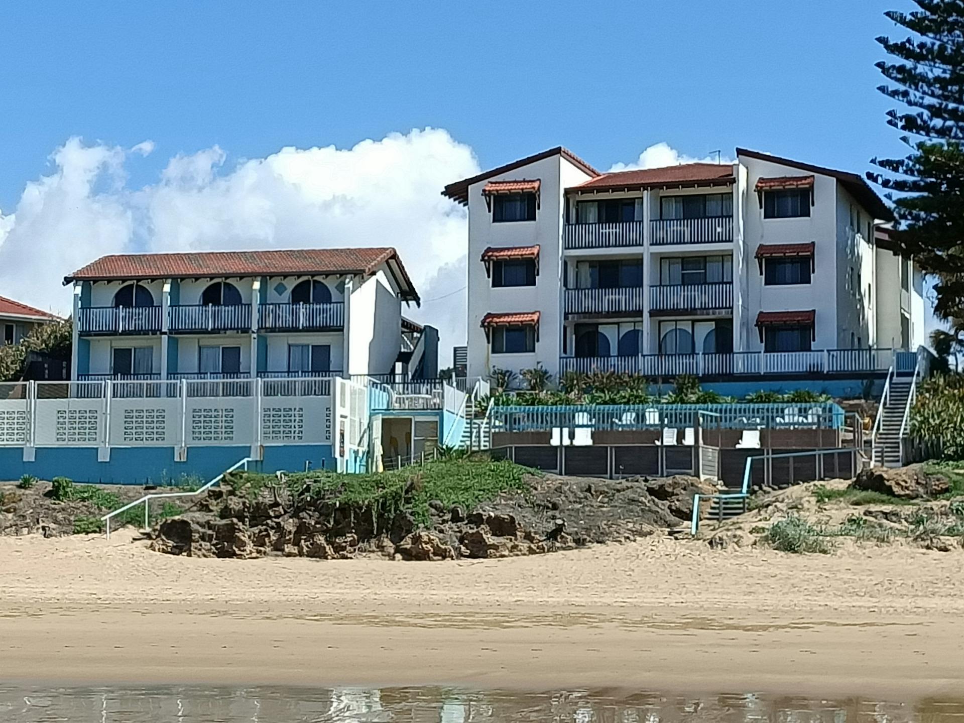They offer Studio style rooms for overnight stays and short breaks to self-contained apartments for longer stays and families accommodating up to 6 people all with views of either the pool or beach, free wi fi and air conditioning.