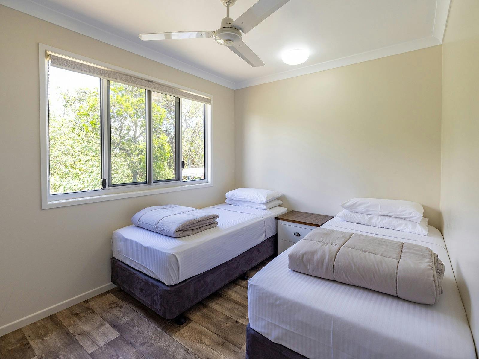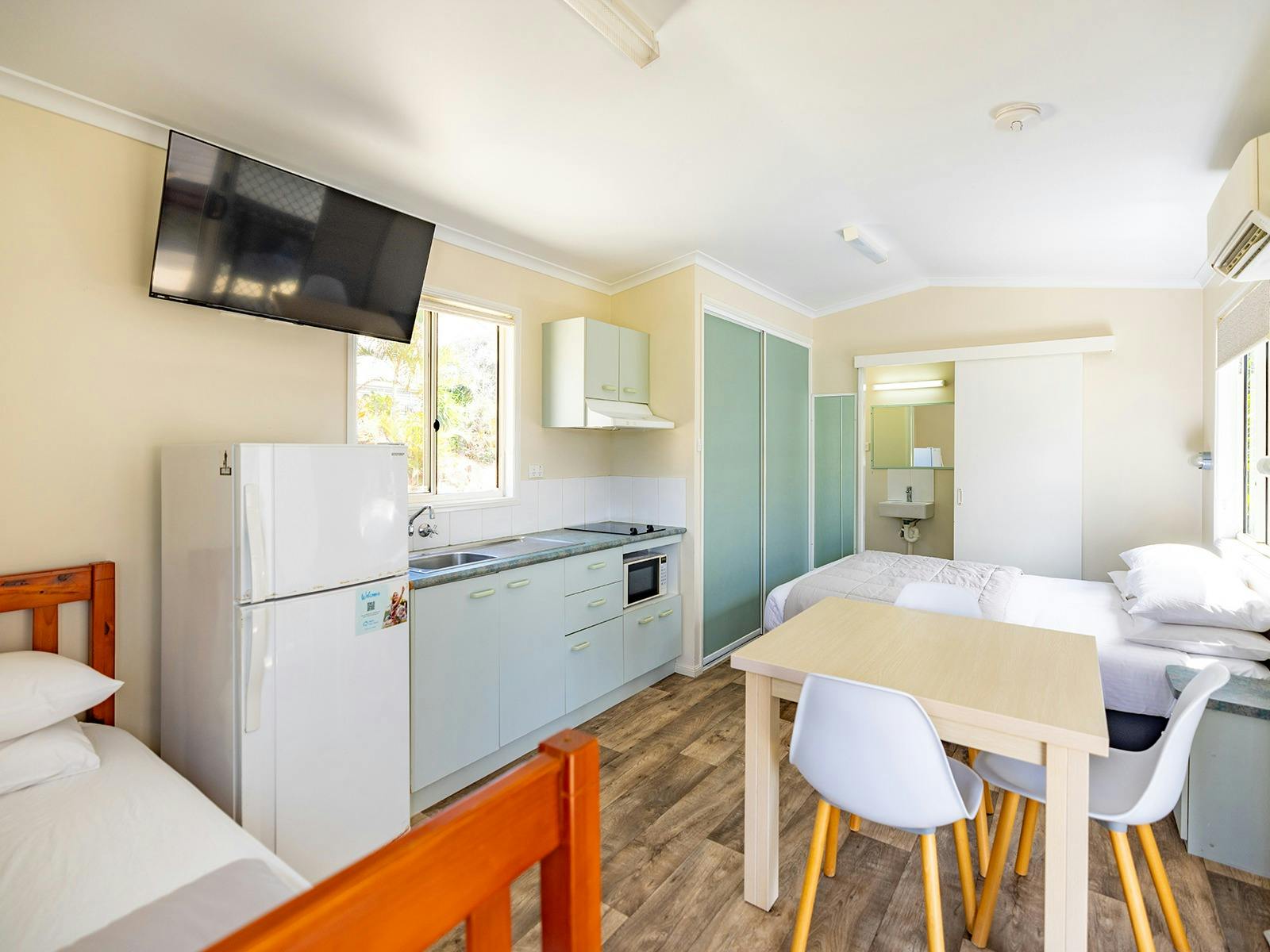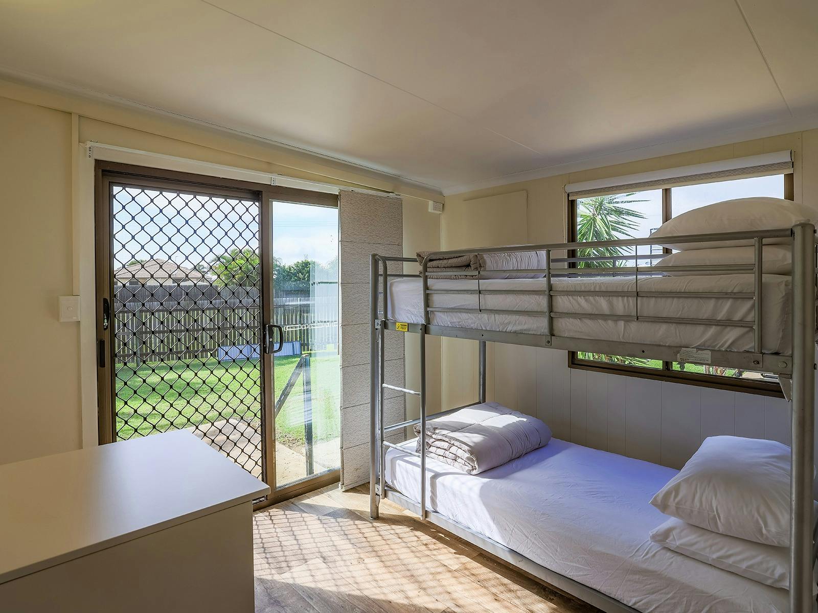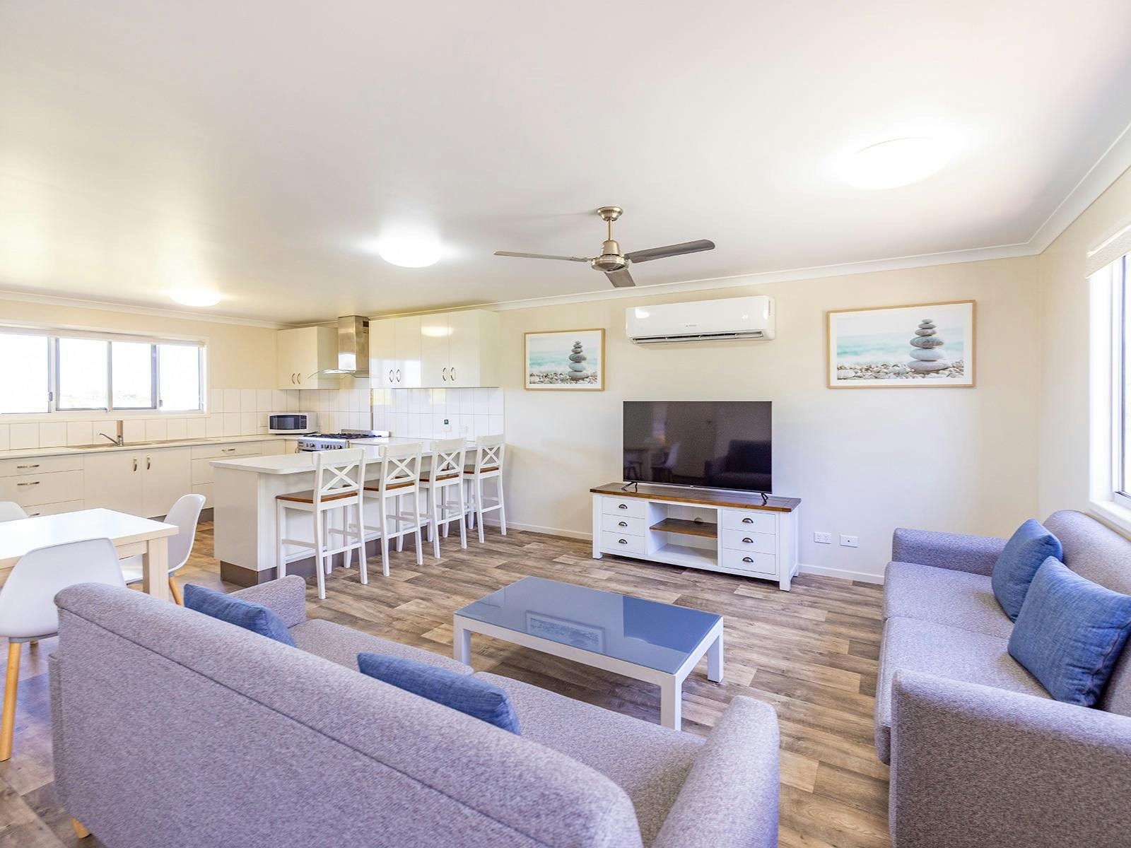 Self-contained accommodation including two and three-bedroom cottages, one and two-bedroom cabins and villas and open plan studios are available as well as group accommodation sleeping up to 24 individuals. Site accommodation options include large powered grass or concrete sites and unpowered grass sites suitable for caravans, motorhomes, campervans and tents.
