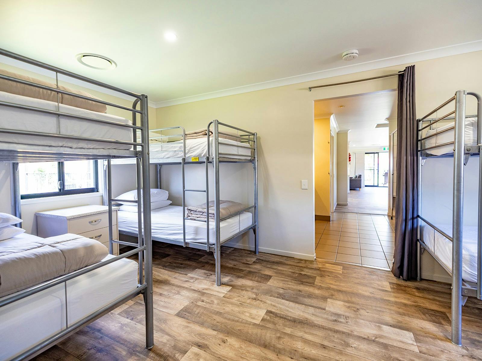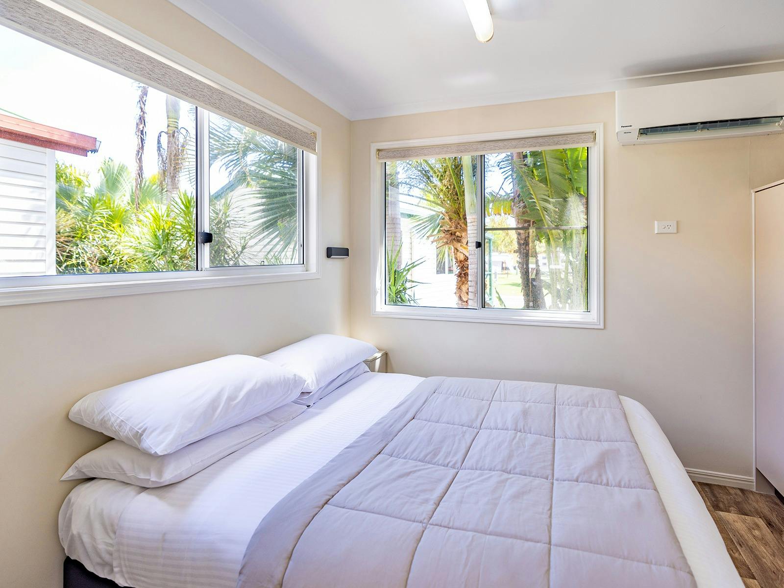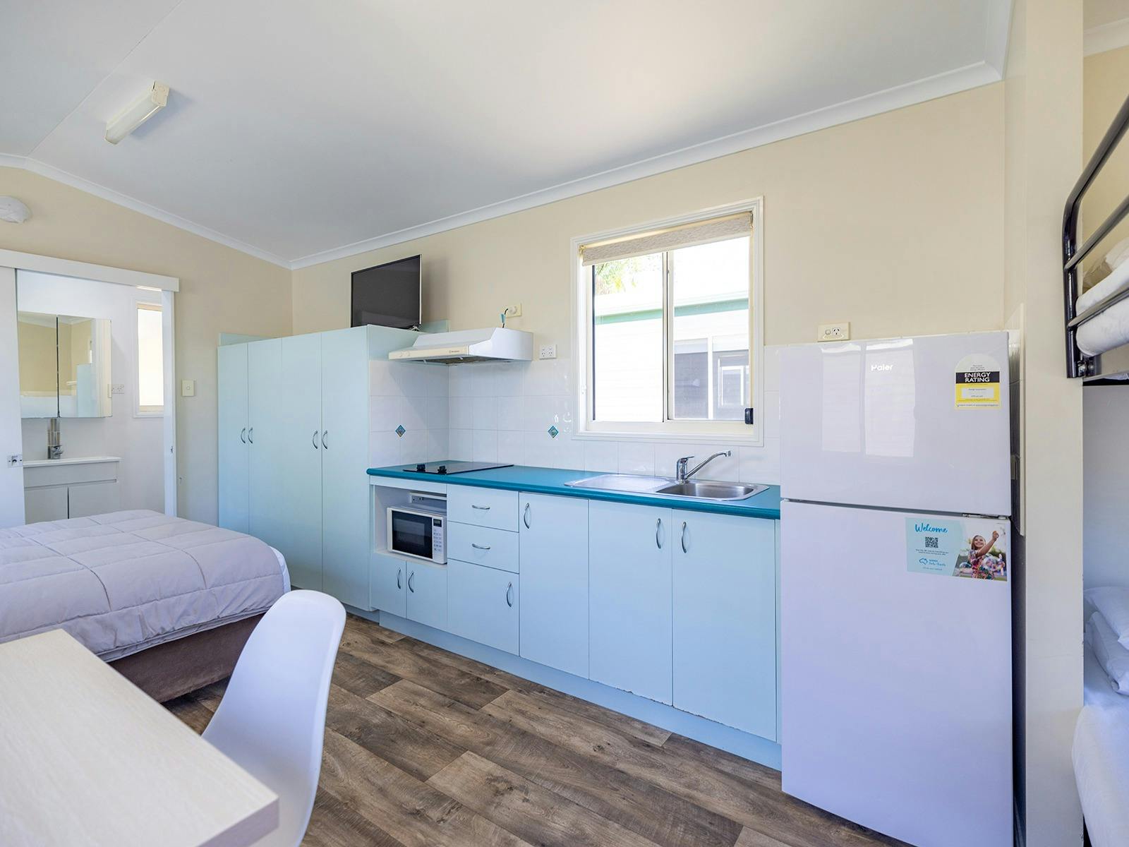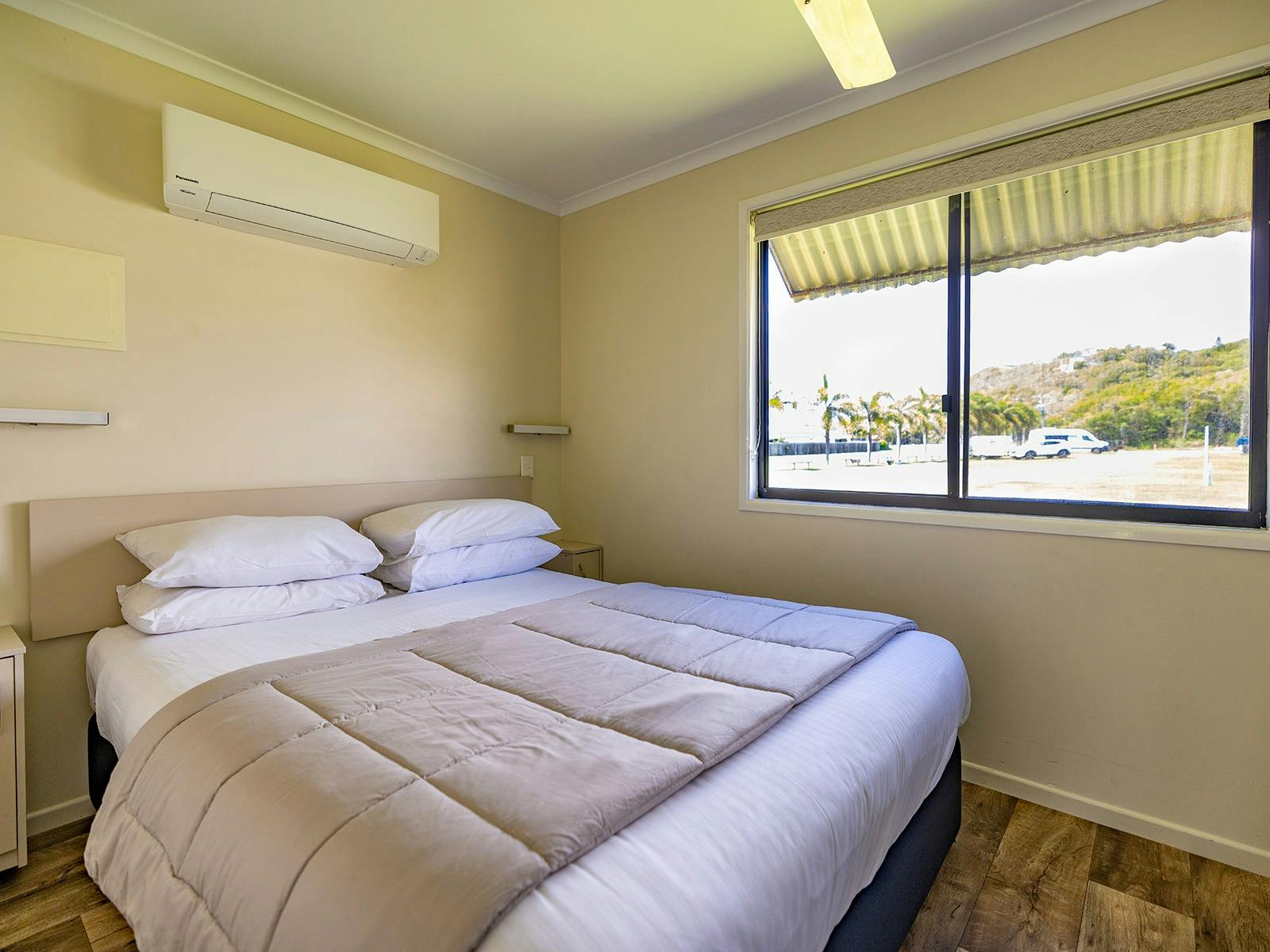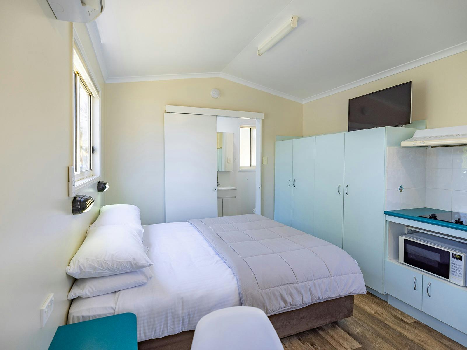 Self-contained accommodation including two and three-bedroom cottages, one and two-bedroom cabins and villas and open plan studios are available as well as group accommodation sleeping up to 24 individuals. Site accommodation options include large powered grass or concrete sites and unpowered grass sites suitable for caravans, motorhomes, campervans and tents.