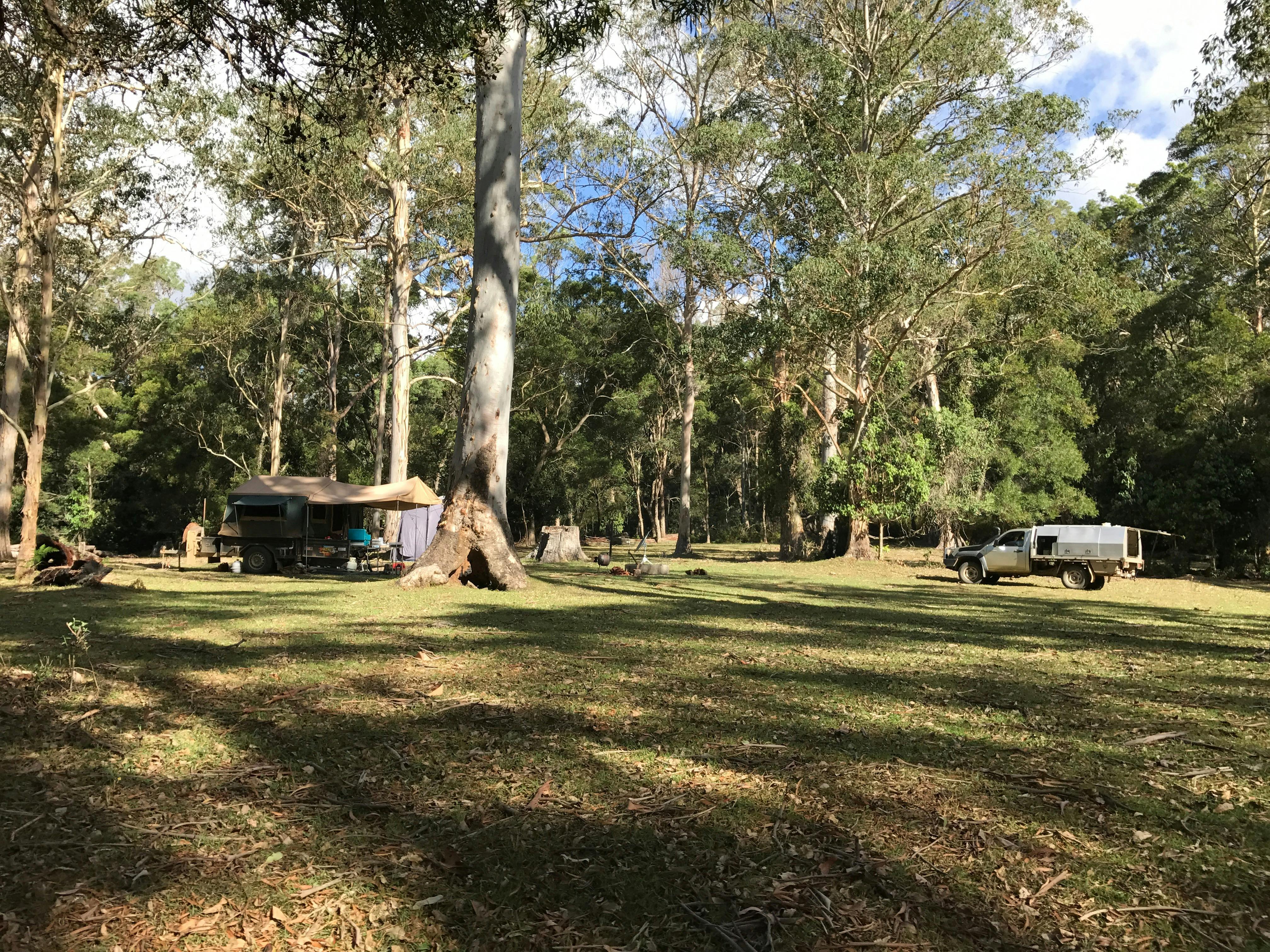The Wall and Griffith Creek camping areas are flat open grassy areas near the creek. The Razorback camping area is a secluded small camping area in a tall blackbutt forest setting.