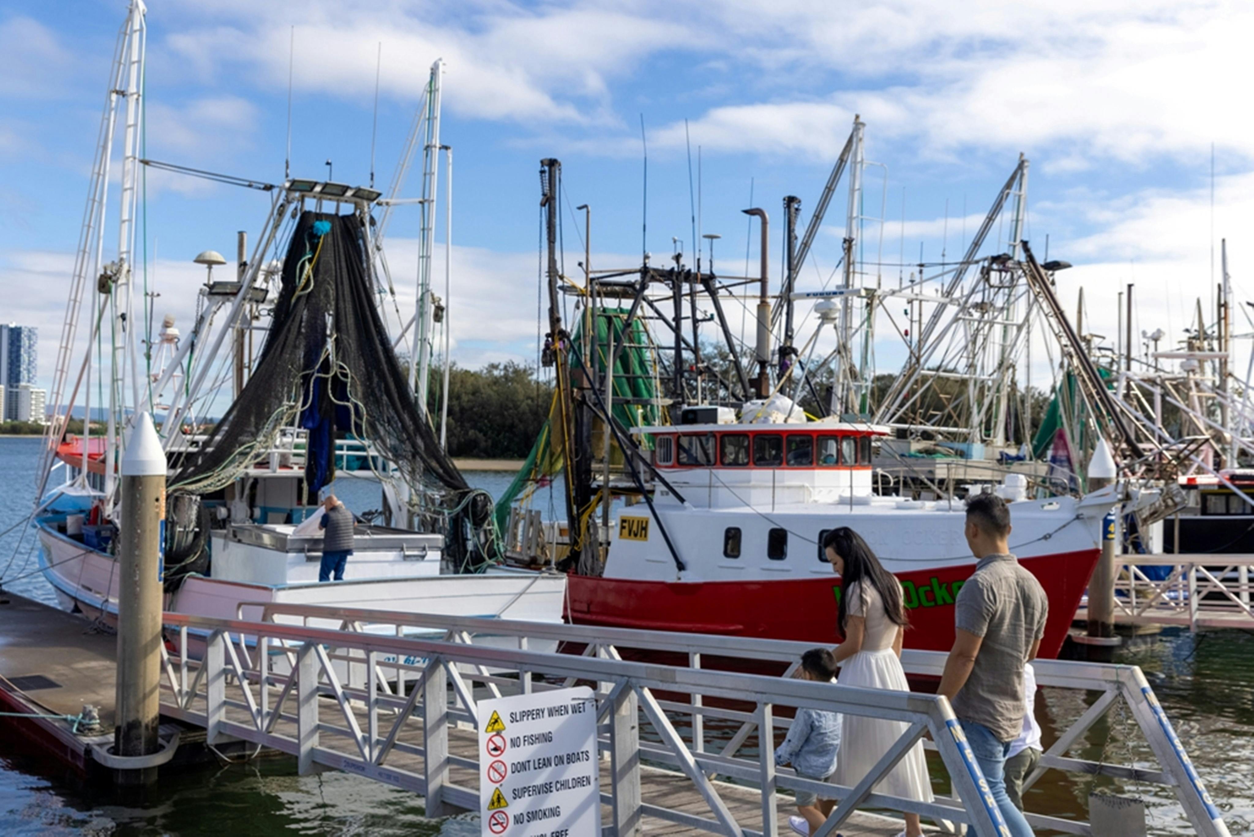 The fishing fleet consists of Prawn Trawlers, Tuna Long Liners and a Spanner Crab vessel, which all operate in the pristine waters off the Gold Coast. These vessels return to port most days loaded with the freshest seafood available for sale direct from the boat, often by the person who caught it.