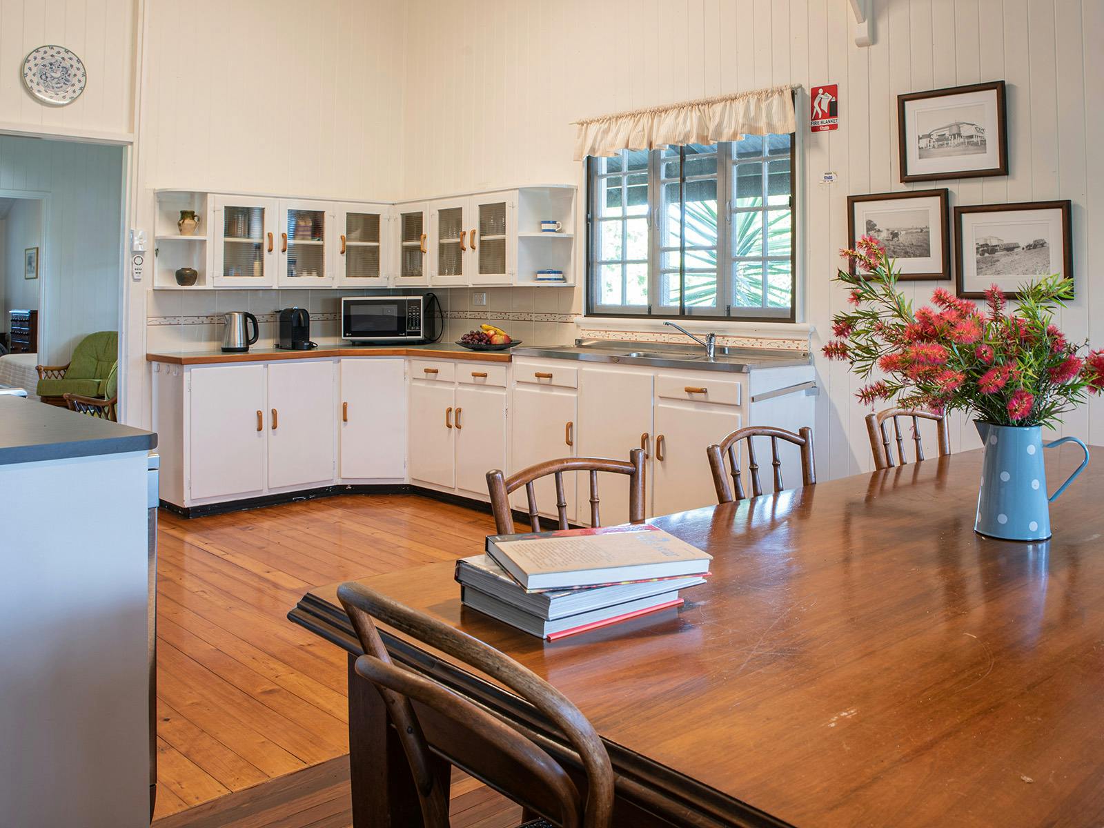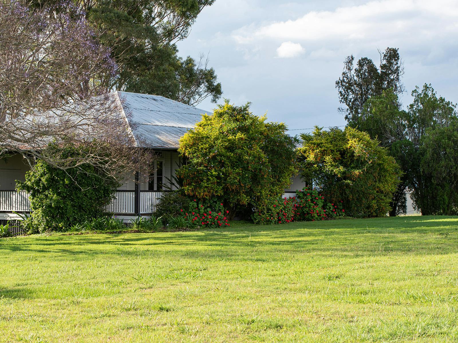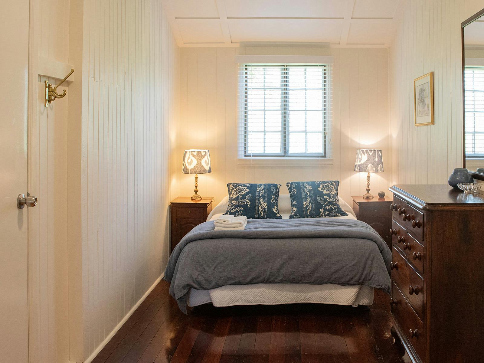 The cottage sleeps up to nine in four bedrooms (two queen bedrooms, one double bedroom and one with a double bed and single). There are two and a half bathrooms. The main bedrooms have traditional French doors opening out onto the verandah and the old-style, tongue-and-groove timber walls throughout are a typical Queenslander feature. The large country kitchen is fully equipped with a full-sized fridge, oven, dishwasher, microwave and a good range of pots, pans, glasses and dishes. The living room has a high-definition, flat screen TV.