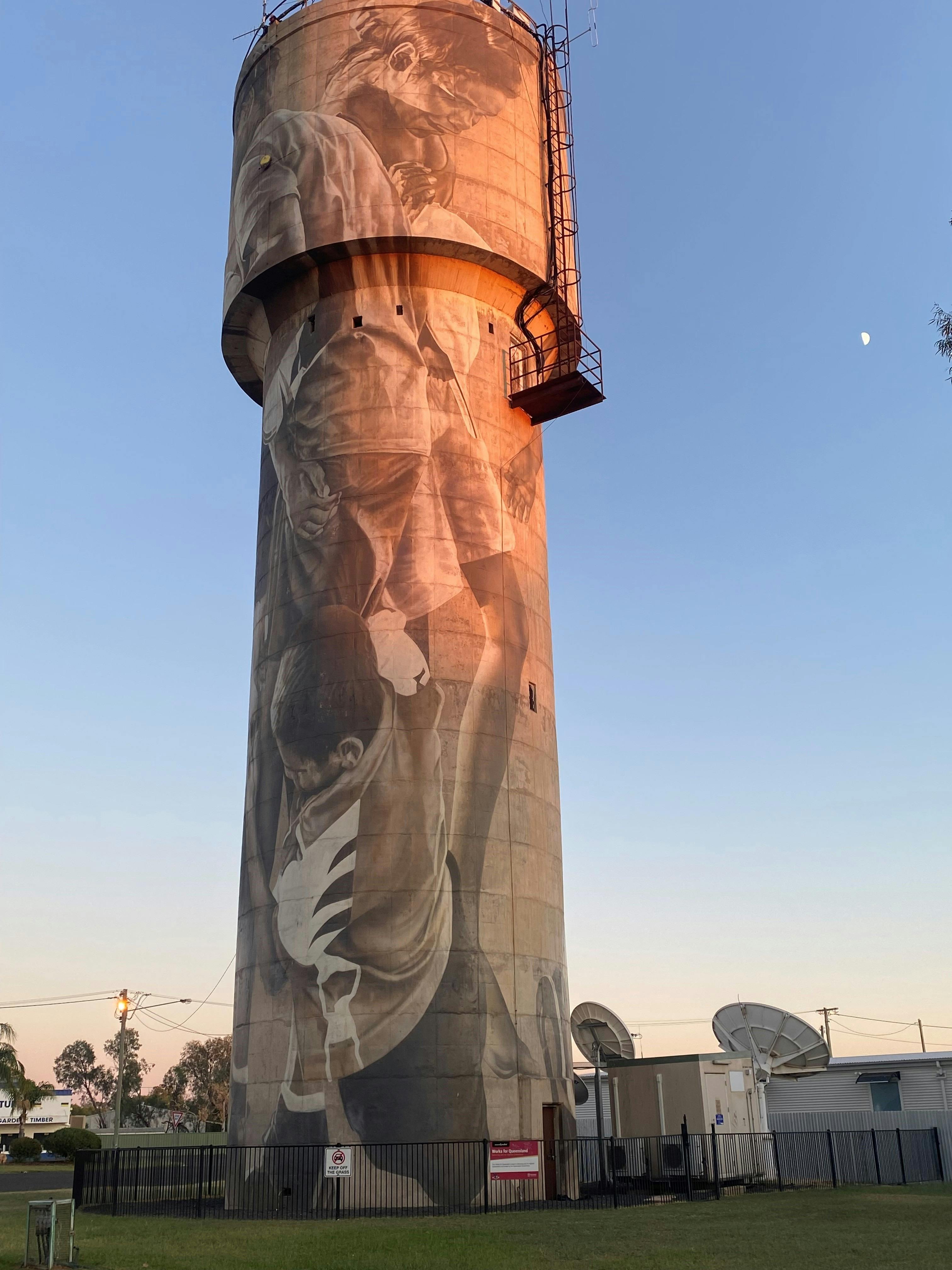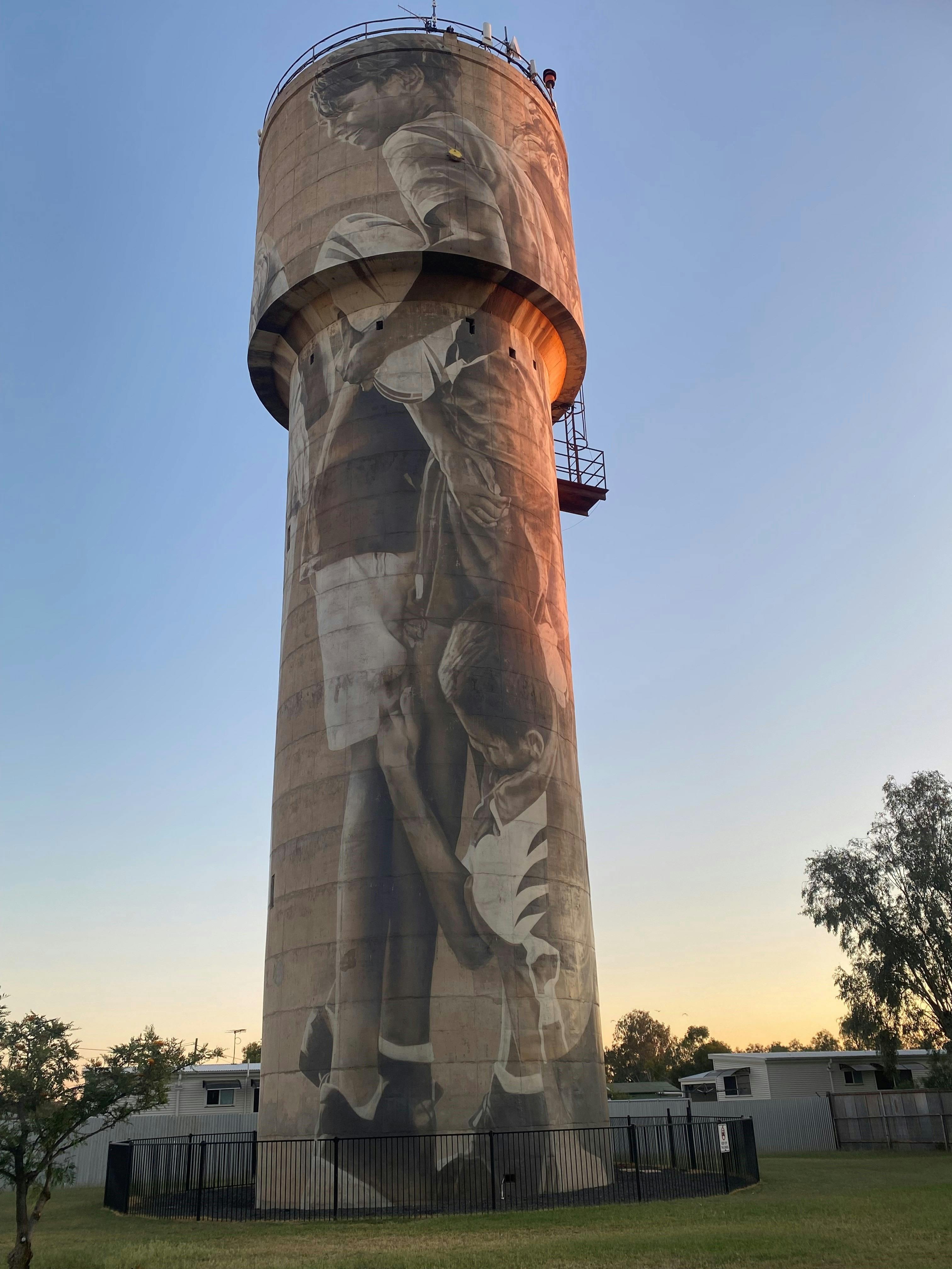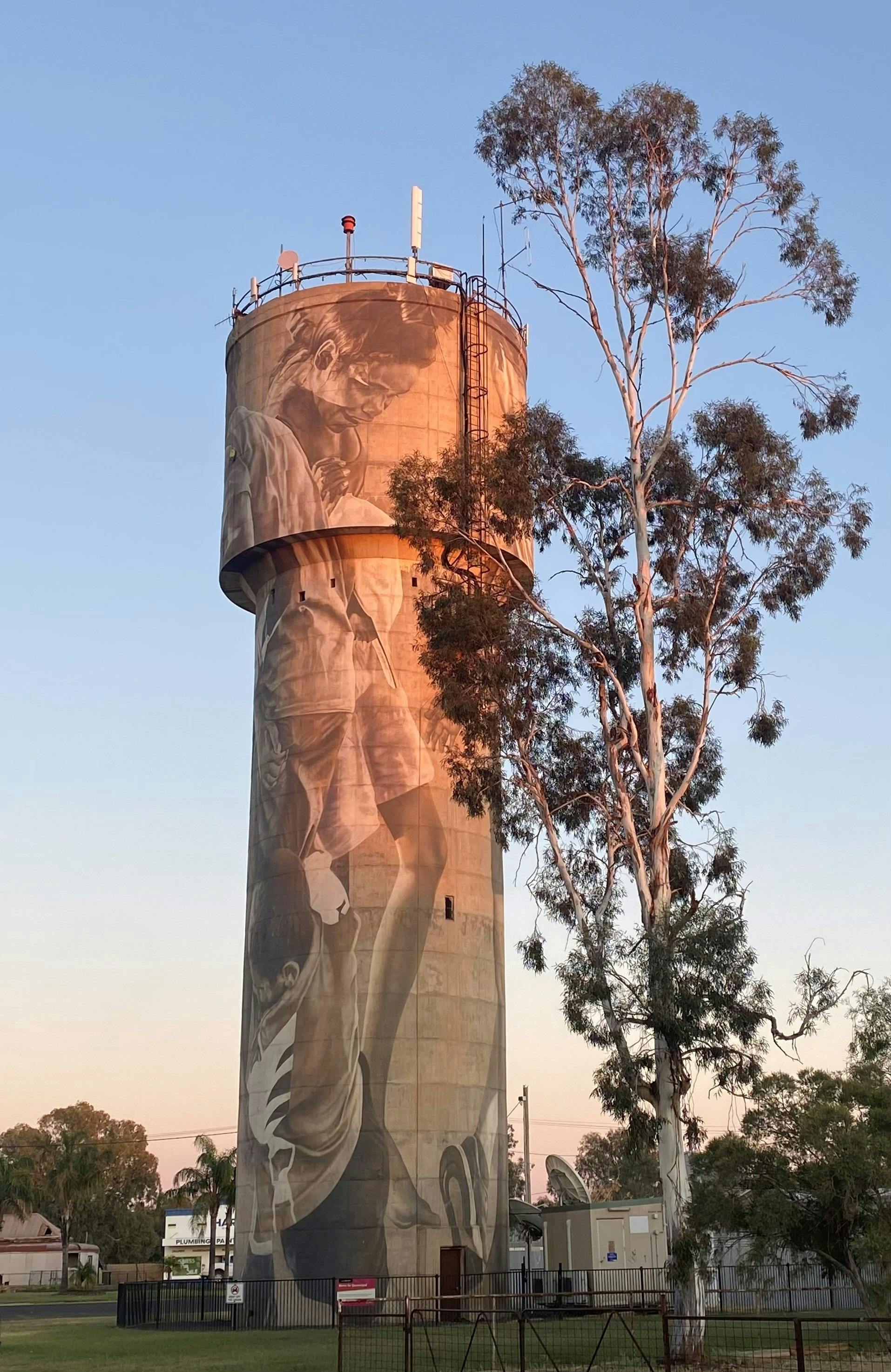 Its story is also based on the same theme as Charleville water tower. The children, it is said, are playing with their neighbours from Charleville, who are 200 kilometres away, they meet twice a year to contest a grand final.