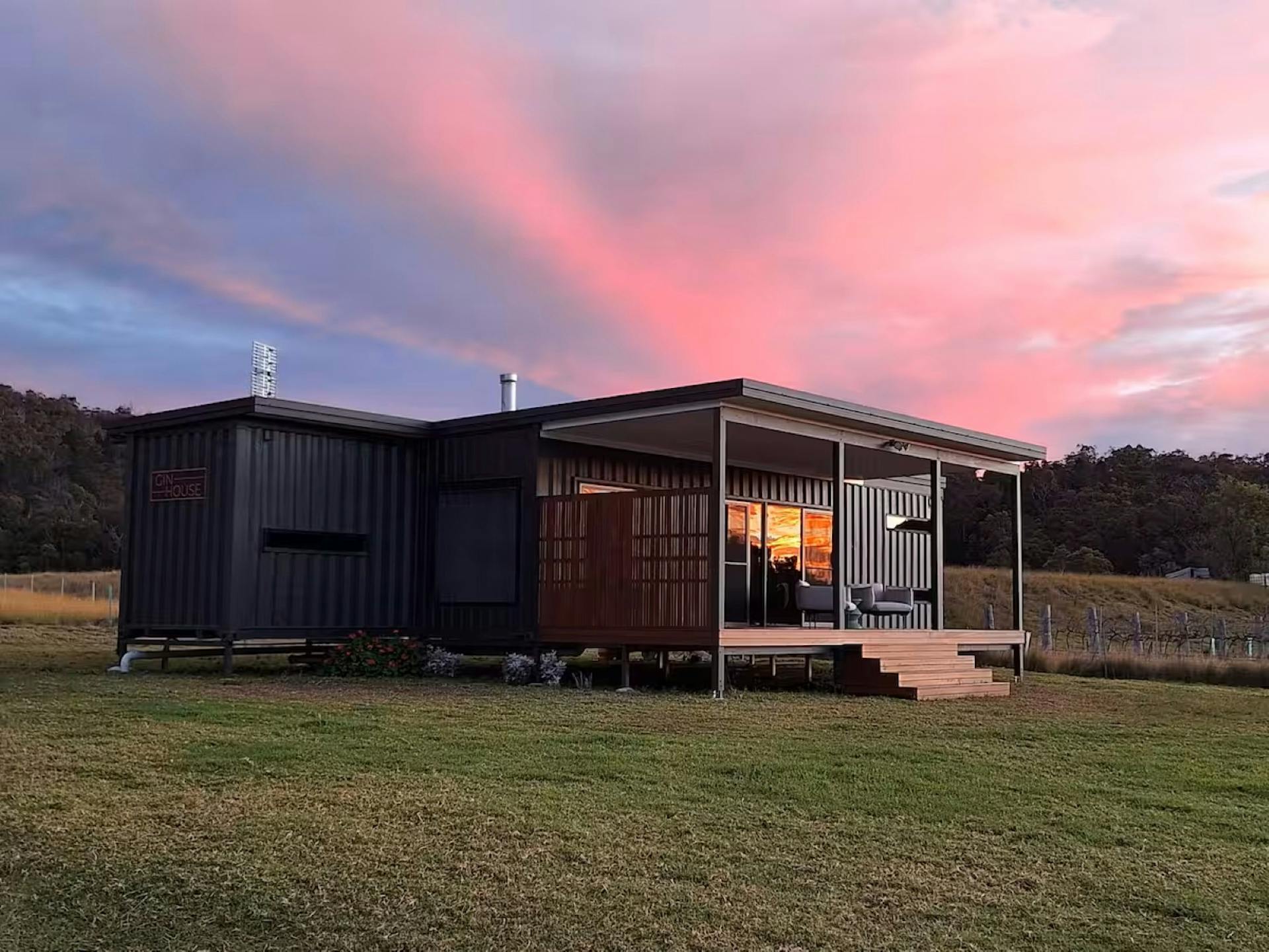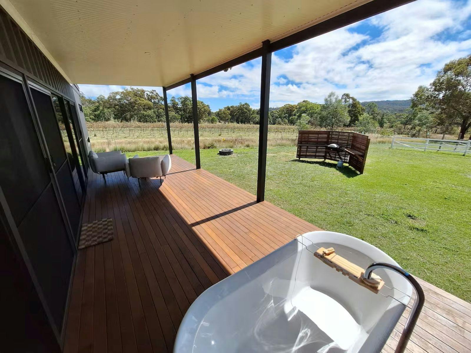 Crafted from two converted shipping containers and set in stunning surrounds, you will enjoy an evening bath on the deck with private views overlooking the property's vineyards.