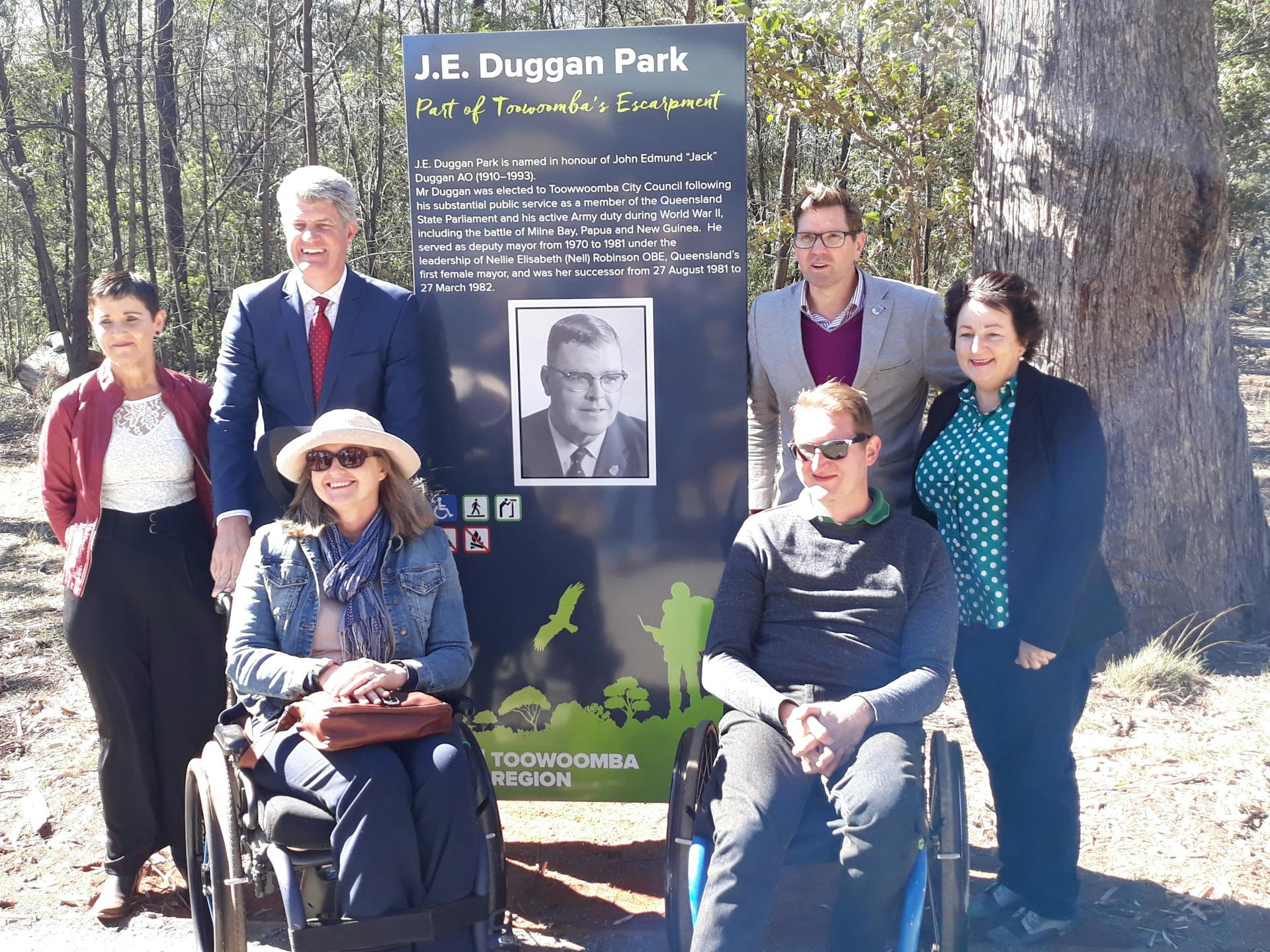 J.E.Duggan Park is the only all abilities bushland park in Toowoomba. It has DDA compliant toilet, wheelchair friendly barbeque, water fountain and picnic tables, Sensory Walk that caters for vision impaired people, braille interpretive signage, wheelchair access trail and beautiful lookout Lockyer Valley lookout with views of Table Top Mountain.