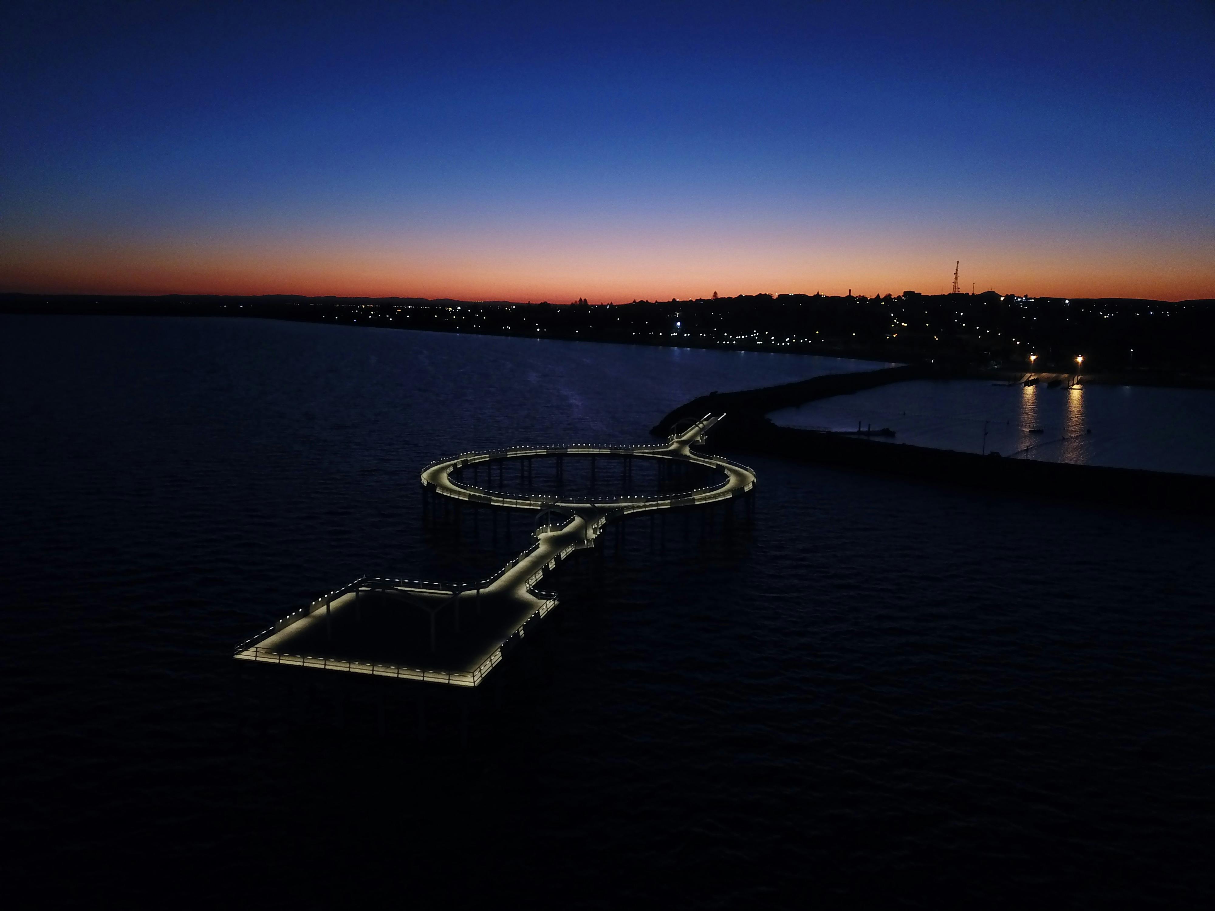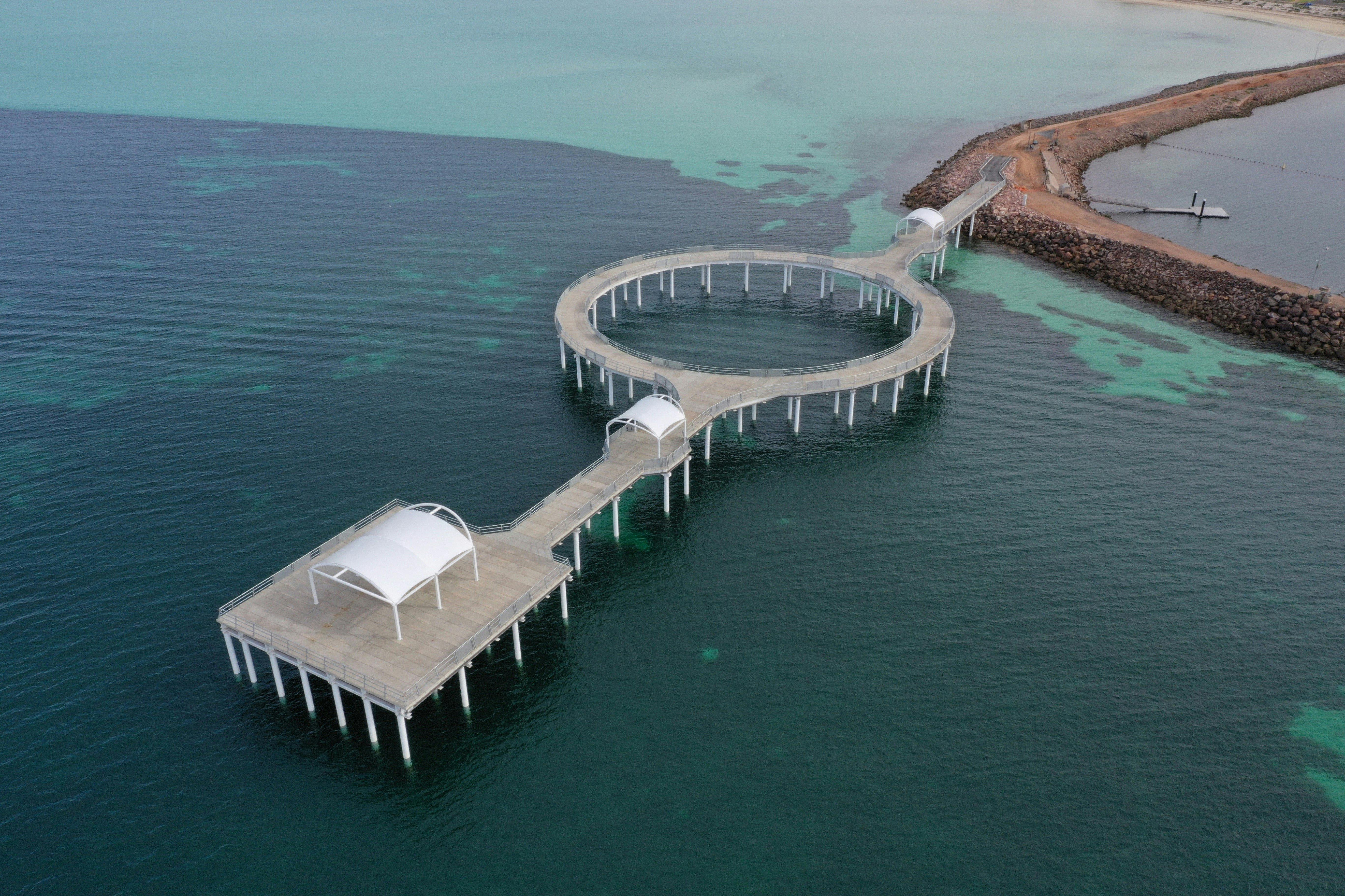 The only circular jetty in Southern Hemisphere. The once-in-a-generation circular Jetty is an unmissable feature to Whyalla’s impressive foreshore. The unique design was chosen by the community and has a circle feature which is sure to attract fishers, walkers and sightseers. Beginning construction in September 2019, locals and visitors have watched the impressive structure come to life. The jetty is an extensive 315m long including the circumference. Bespoke lighting has been installed the entire length of hand railing creating a 24/7 attraction with a wonderful ambiance at night. Disabled access is a key design, with 6 locations of sliding shelves on the top handrail for the children and the disabled to fish from. The huge task of the build was taken up by Maritime Construction, with the local GFG Steelworks supplying all the steel required for the build, except for the 102 unique pylons that were driven into the seabed to support the jetty.