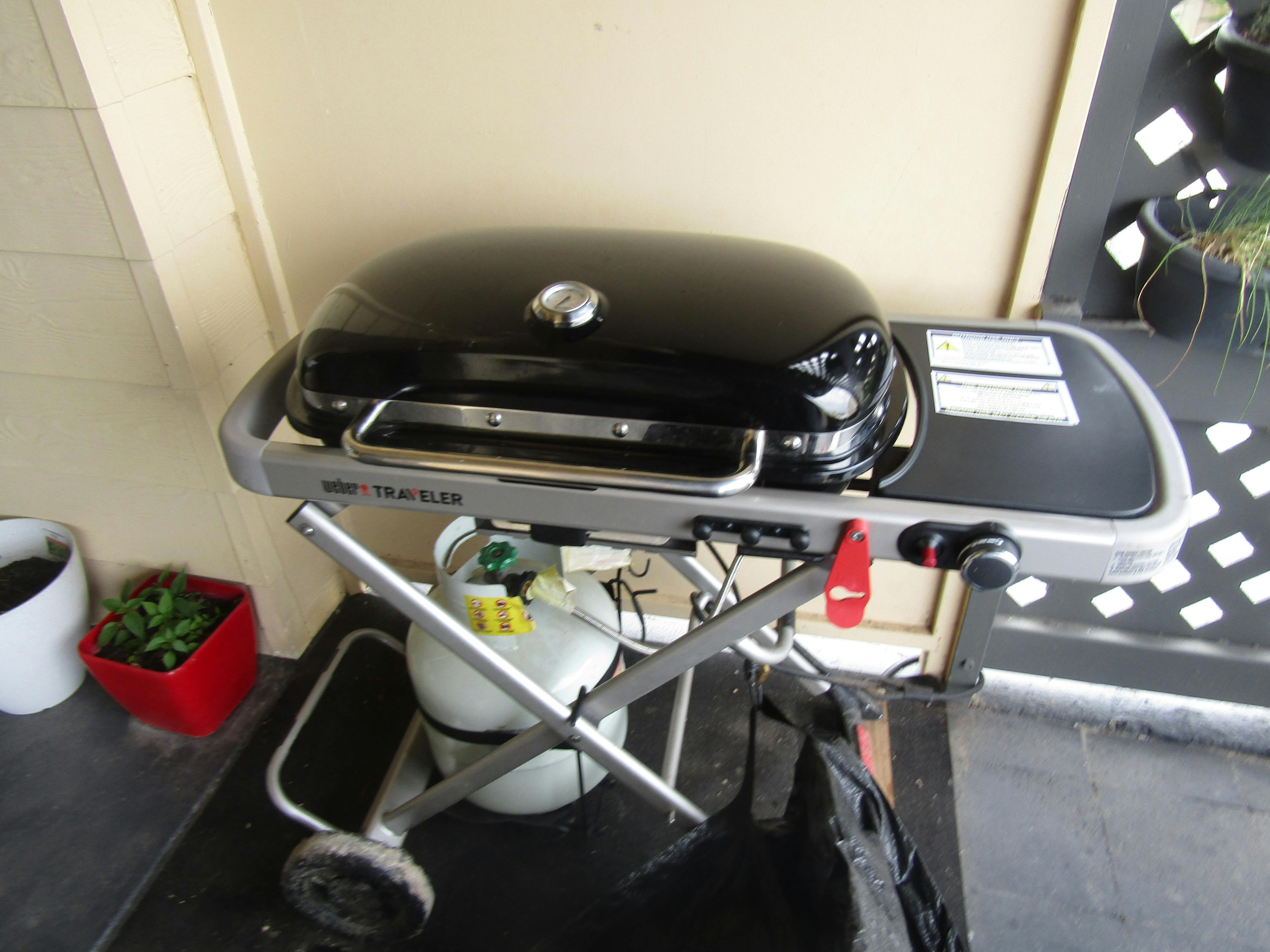 Private patio with sea glimpses, outdoor setting and hooded Weber Traveler gas BBQ.