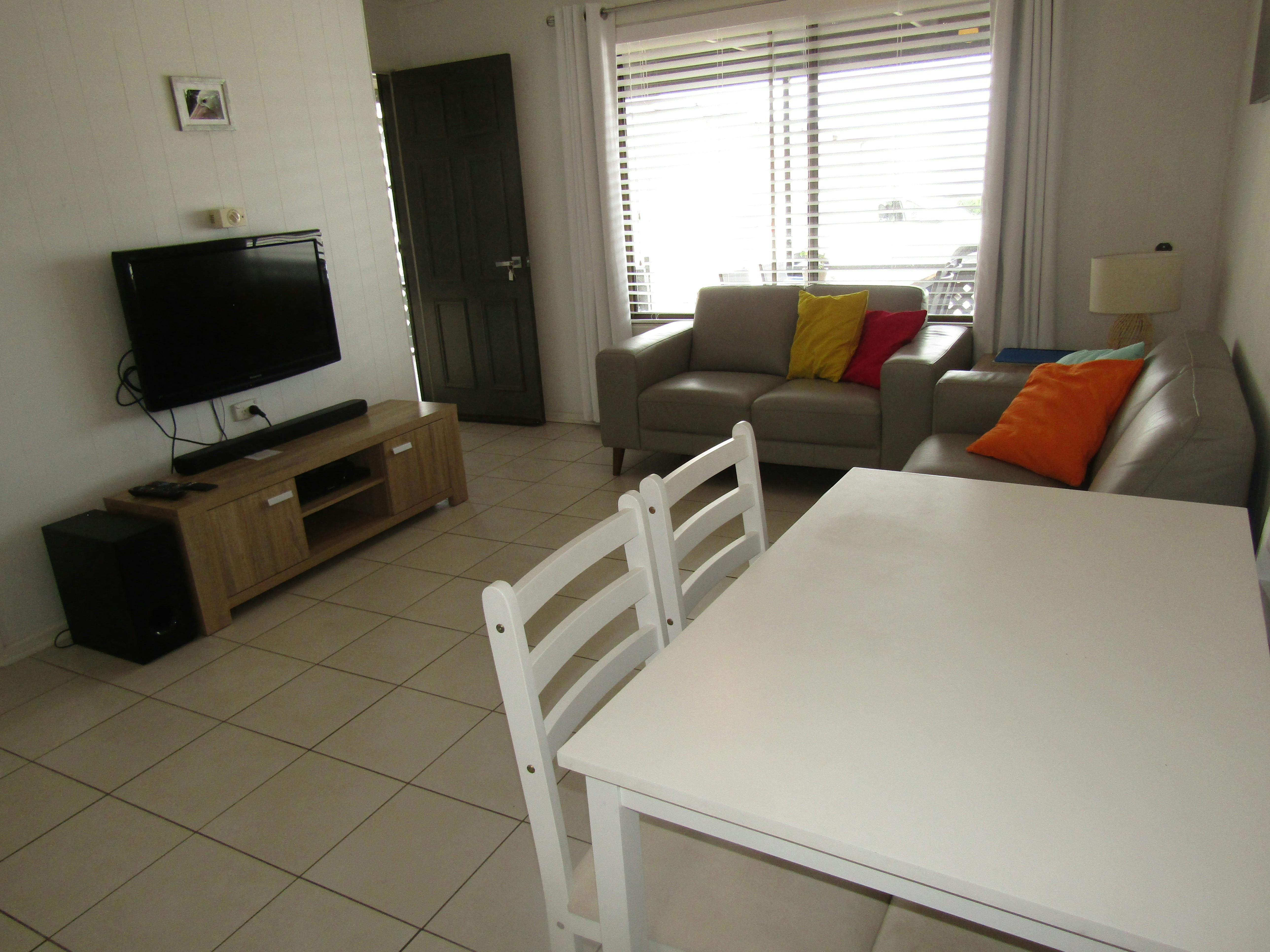 Living area with 4 seater dining table, 2 x two seater lounges, TV-non smart, DVD player, ceiling fan, reverse cycle split system air-conditioner.