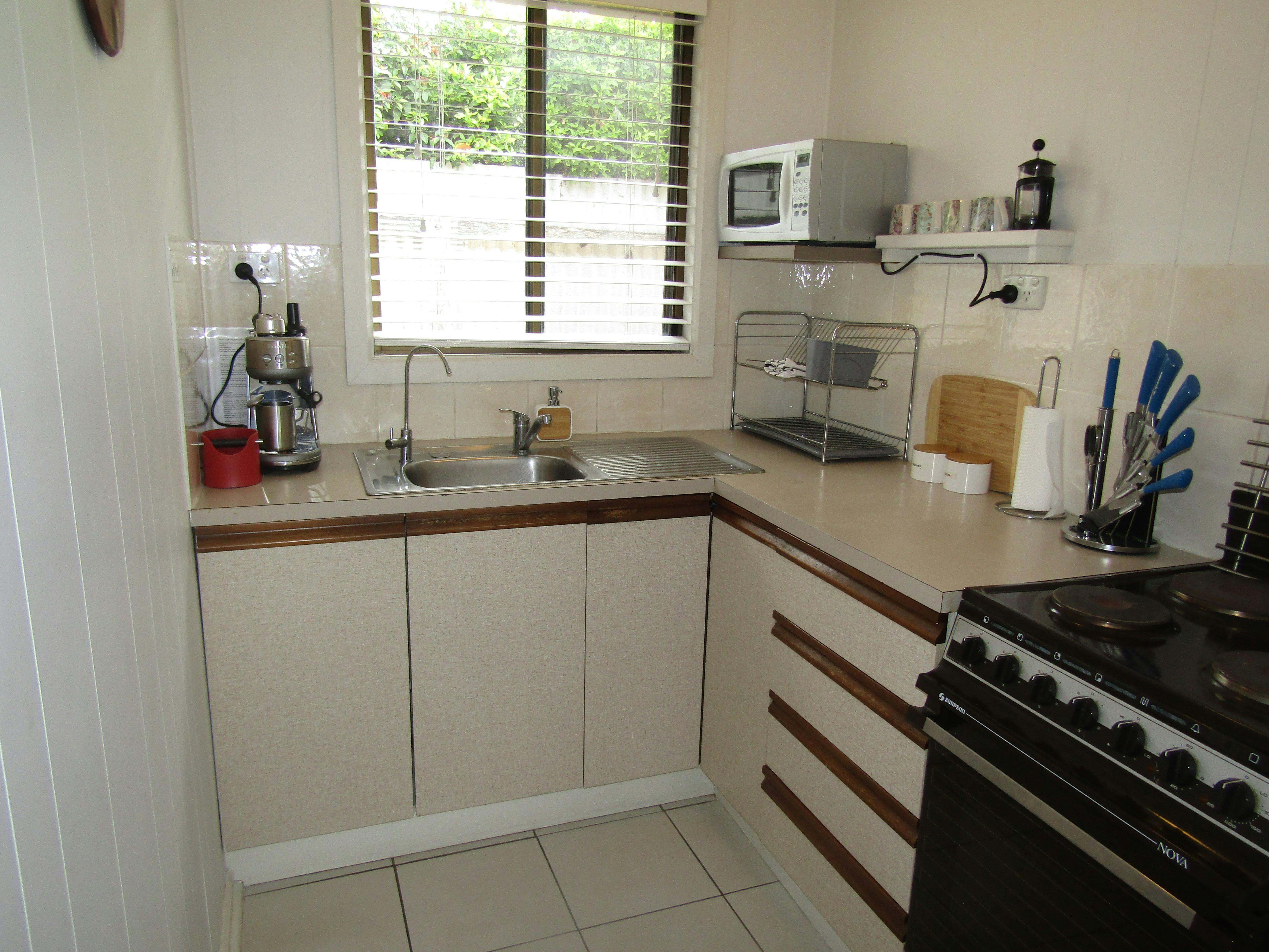 Kitchen with small fridge/freezer, electric oven and stove top, microwave, Breville coffee machine - coffee grounds provided, coffee plunger, kettle toaster.