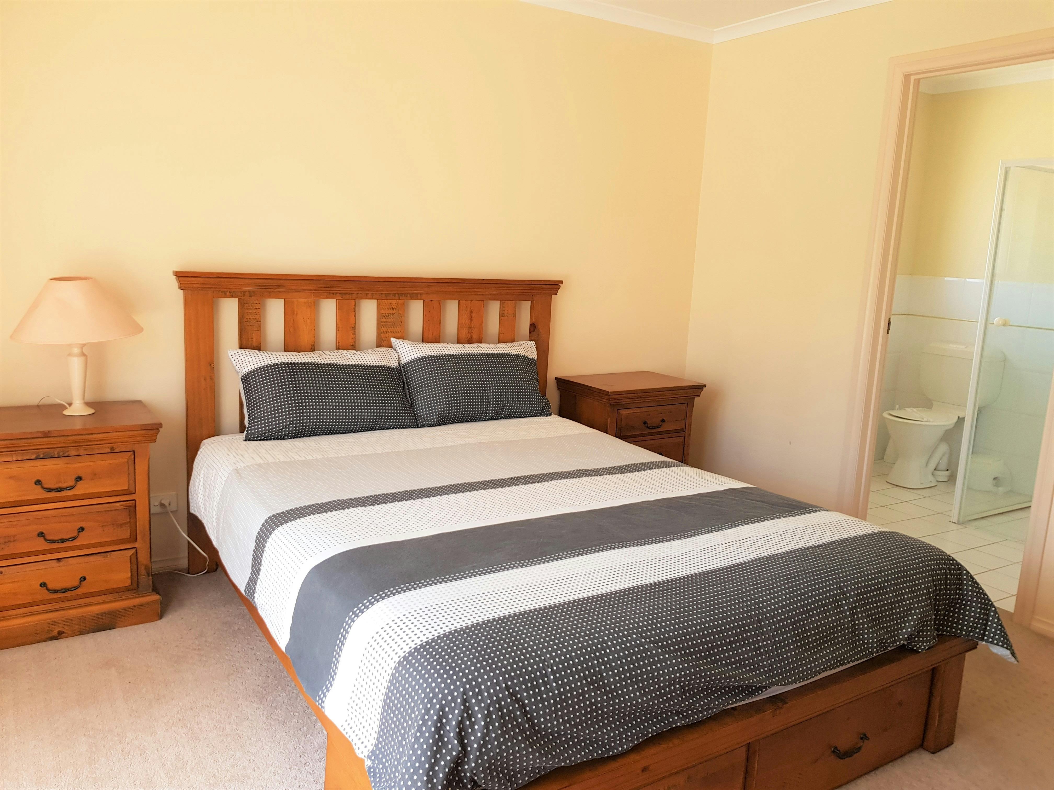 The queen bedroom has an ensuite bathroom with a shower and toilet, plus a main bathroom with a shower and separate bath, as well as a separate toilet.