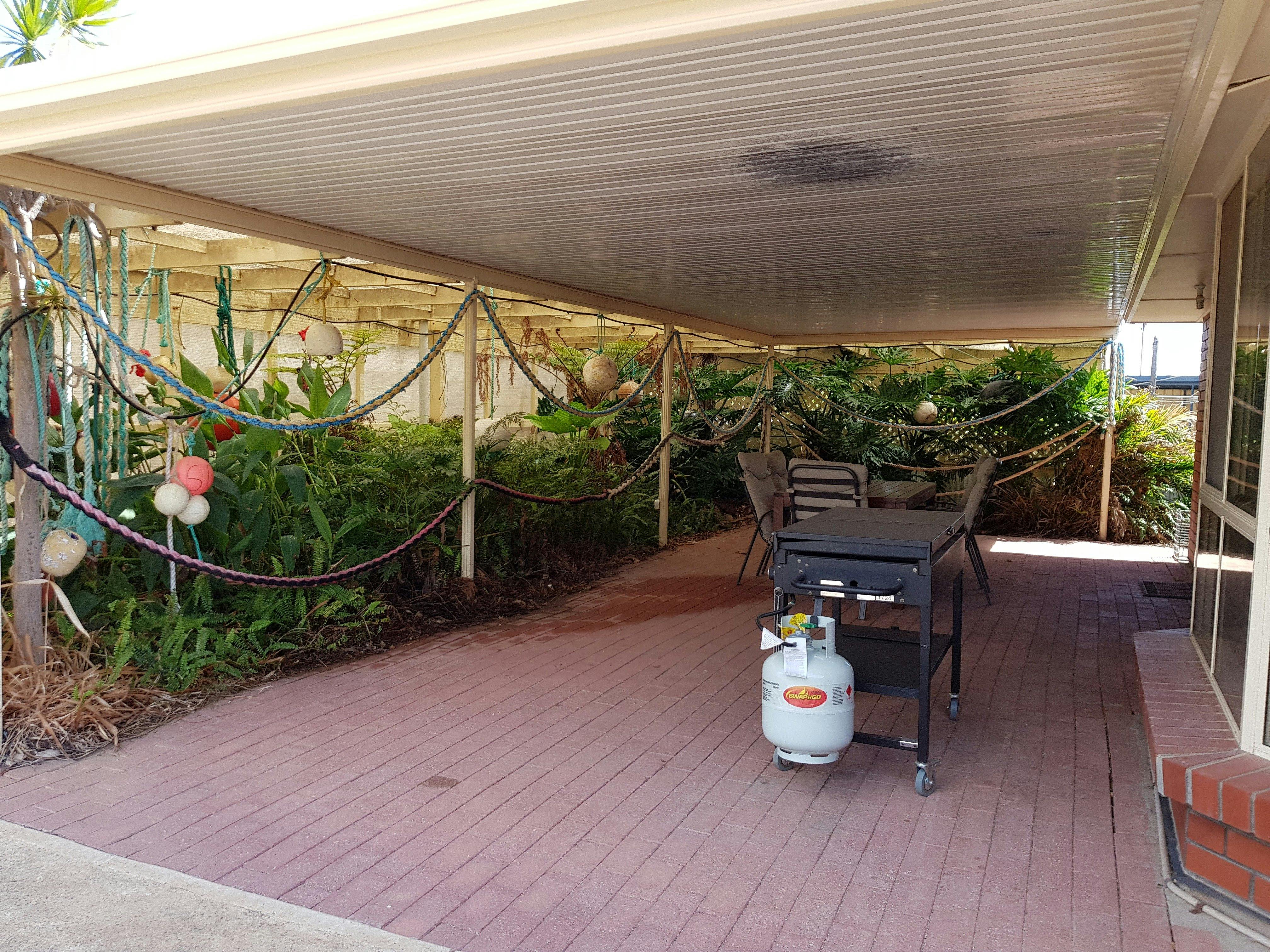 There is a fish cleaning sink in the rear yard, plus a crab cooking pot for use on the barbecue.