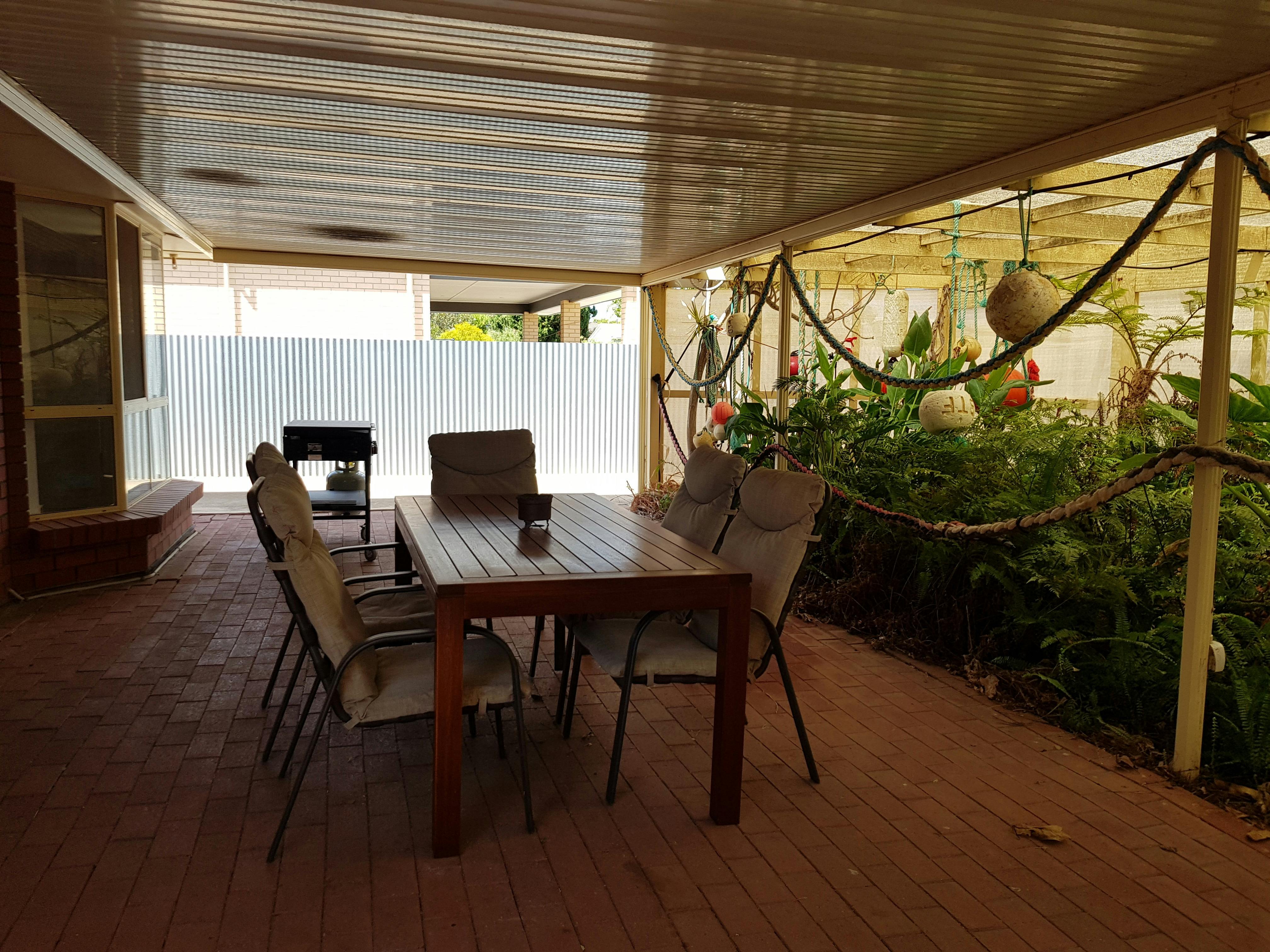 There is a sheltered outdoor dining area at the rear overlooking the yard. The rear yard is secure with a lawned area.