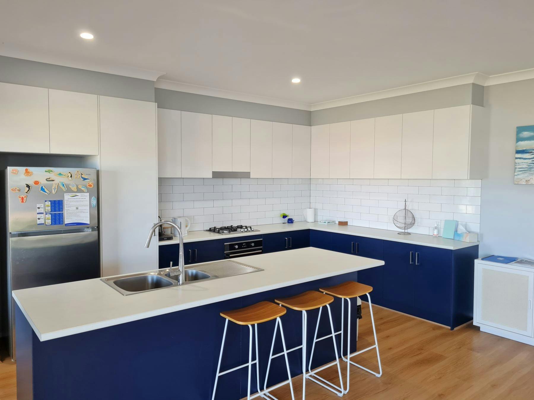 Sleeping up to 13 guests, the house has four large bedrooms: three queens, and a trio bunk, double, single, and trundle in the largest room. A portacot is provided. Guests need to bring their own linen or hire through Country Getaways.