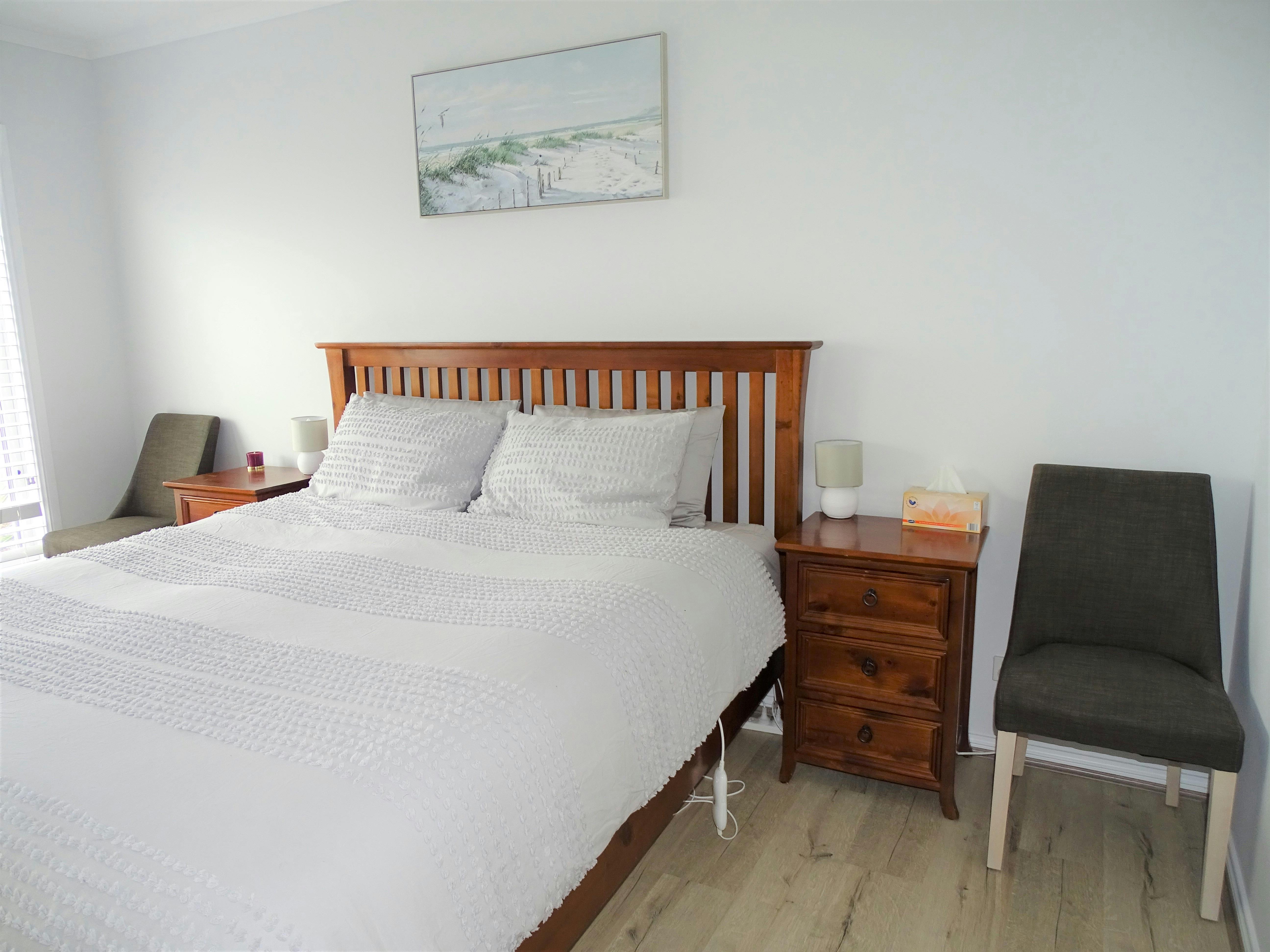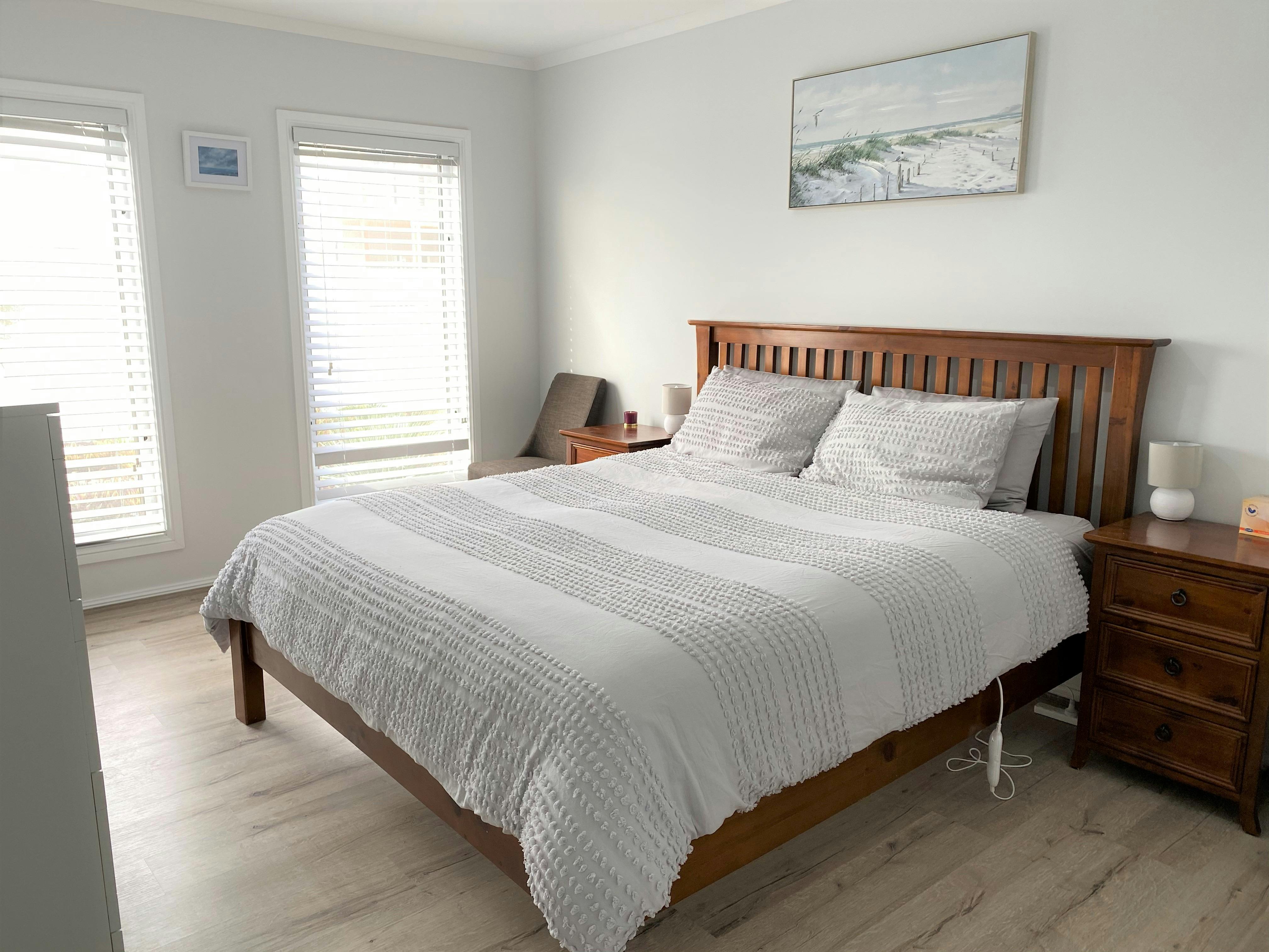 Serenity on Rose can sleep up to 10 people in 4 bedrooms – king, queen, trio bunk, trio bunk. Quilts, blankets, electric blankets and pillows are provided, but guests will need to bring their linen, or linen can be hired.