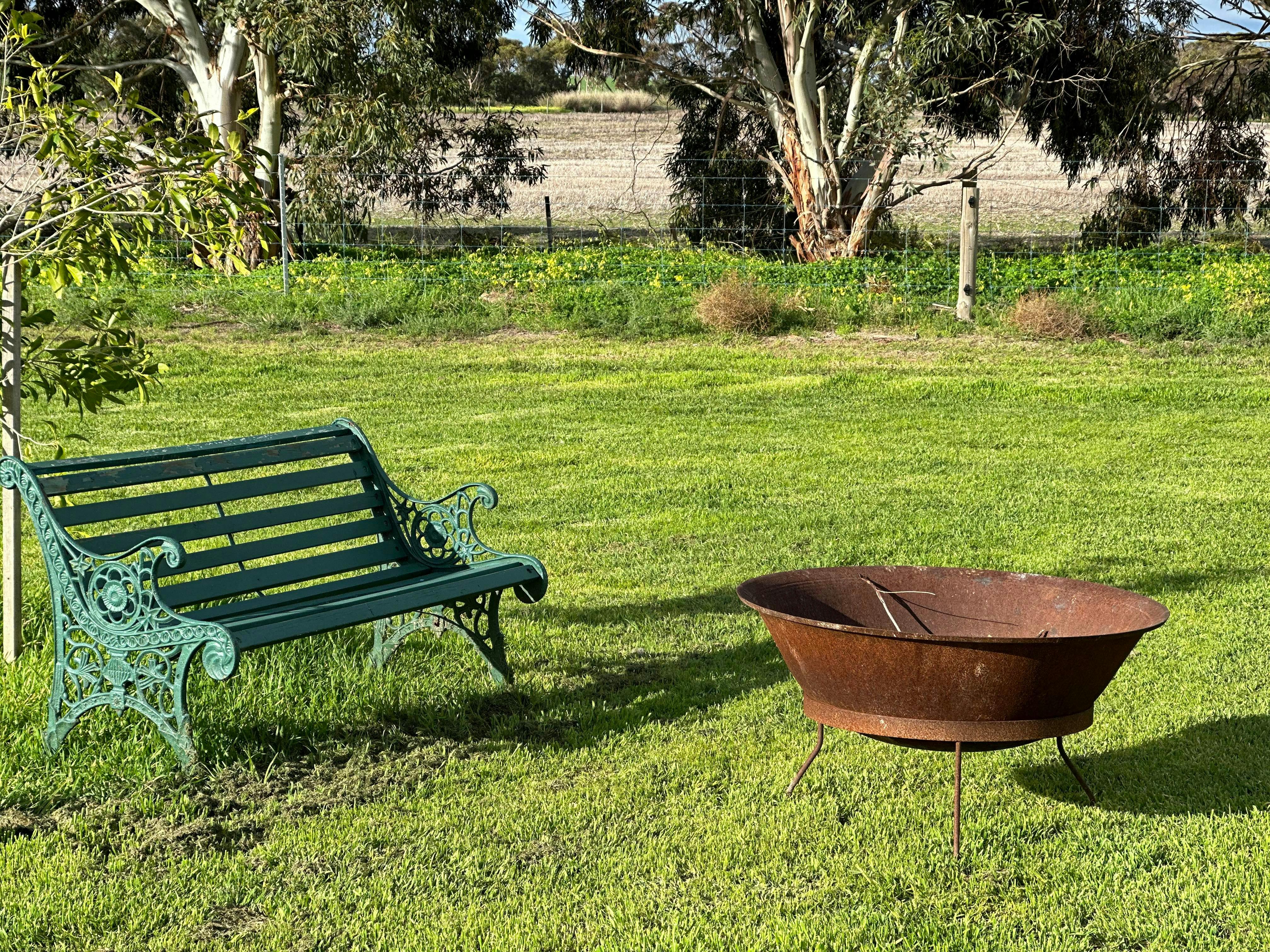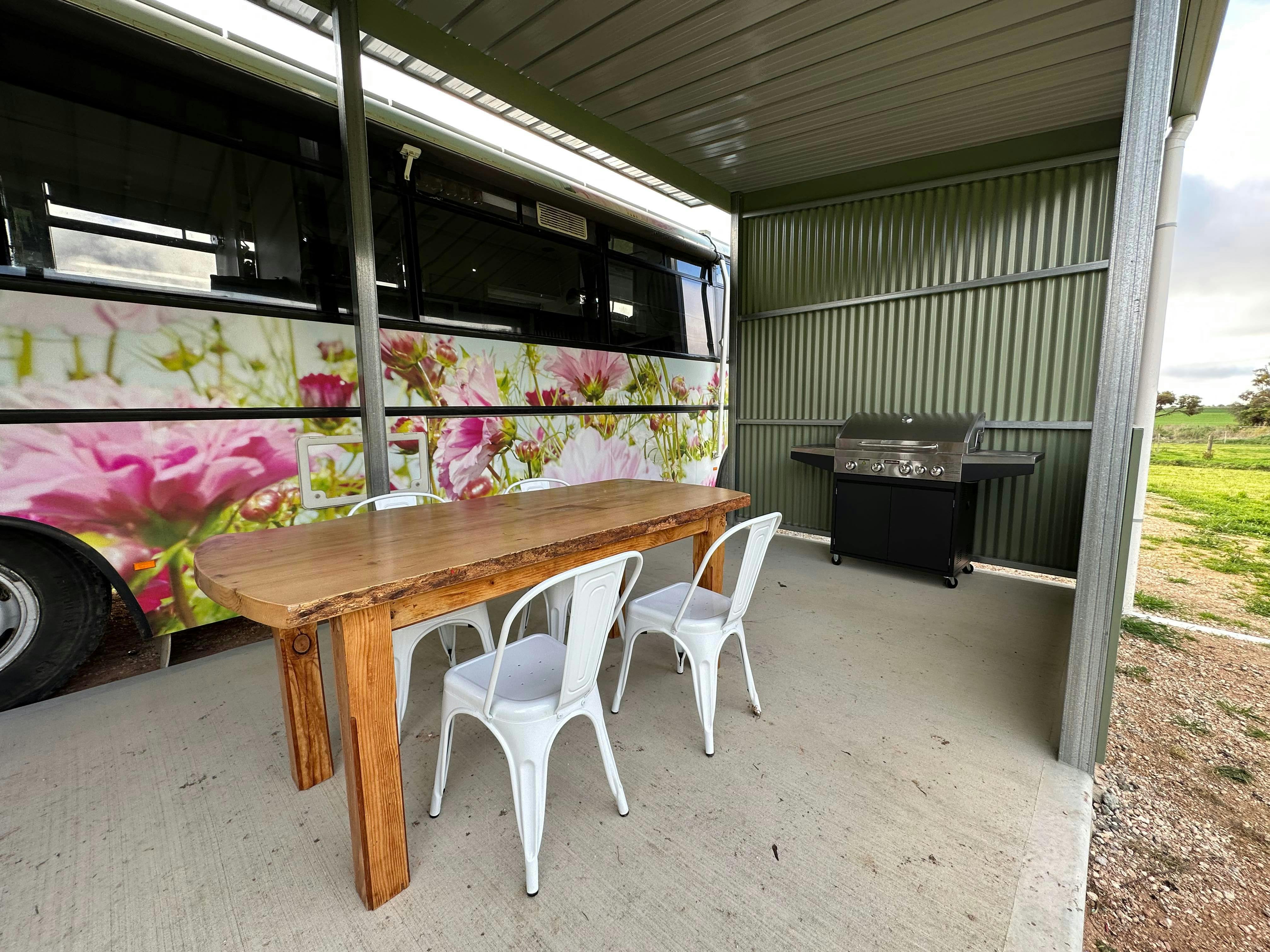 There is a barbeque and dining table under her carport and a fire-pit just outside.