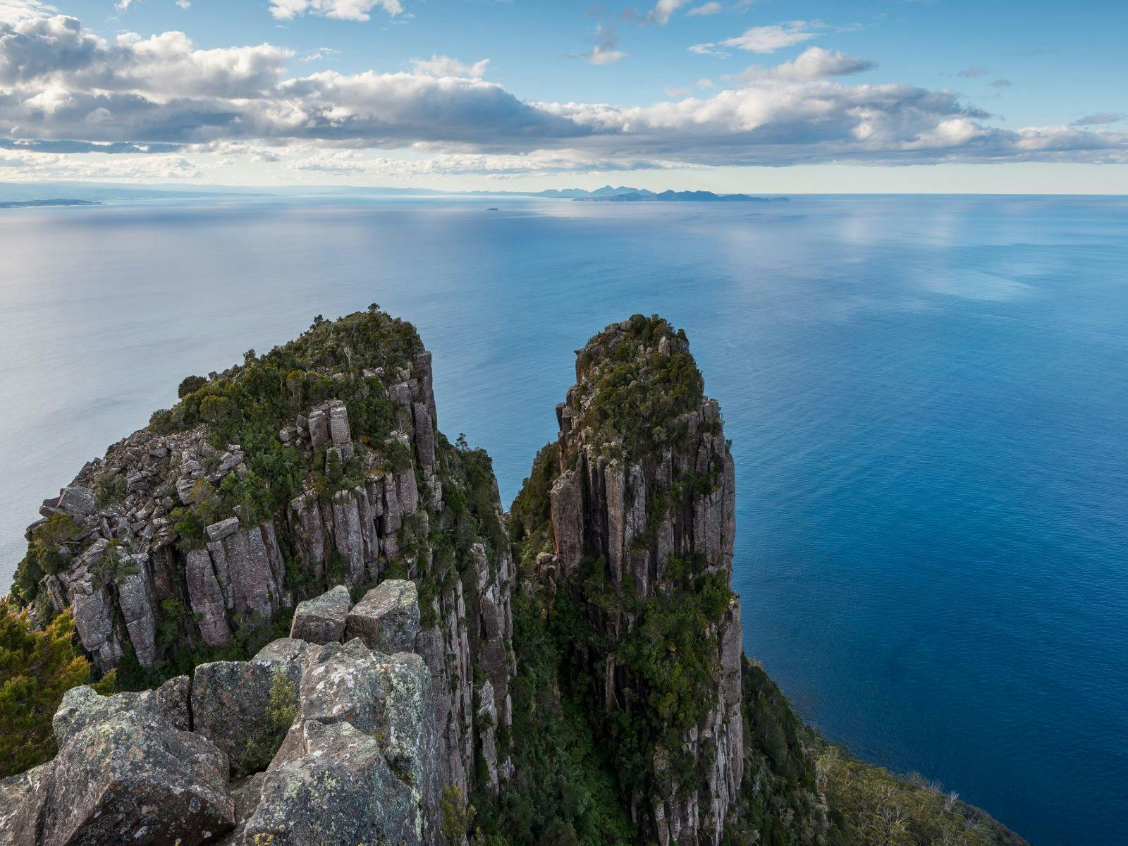 The 11km return walk climbs from grassland, through open forest and tall woodland, to the rocky slopes and towering dolerite columns of the summit (620m). These were named Bishop and Clerk because of the resemblance to a bishop, wearing a mitre, being followed by a clergyman.