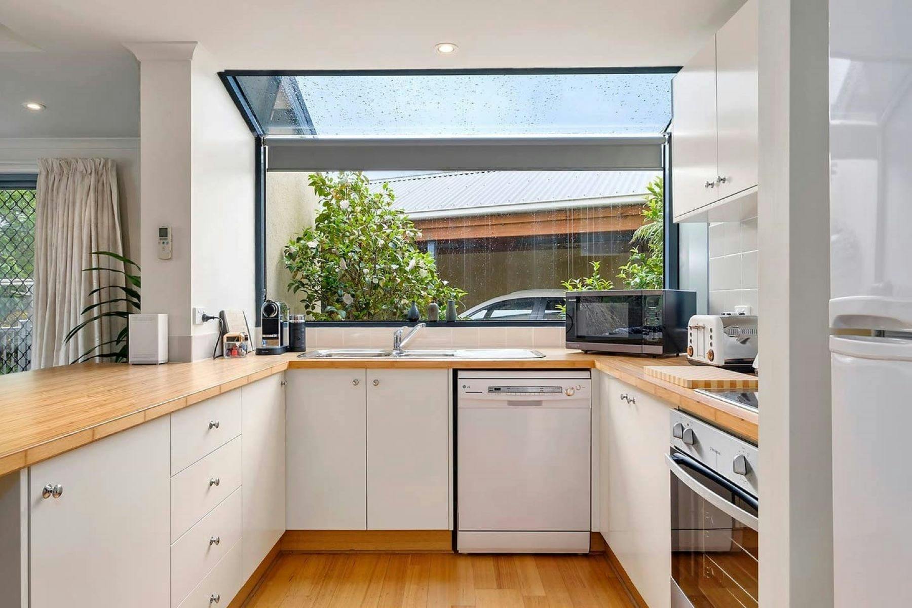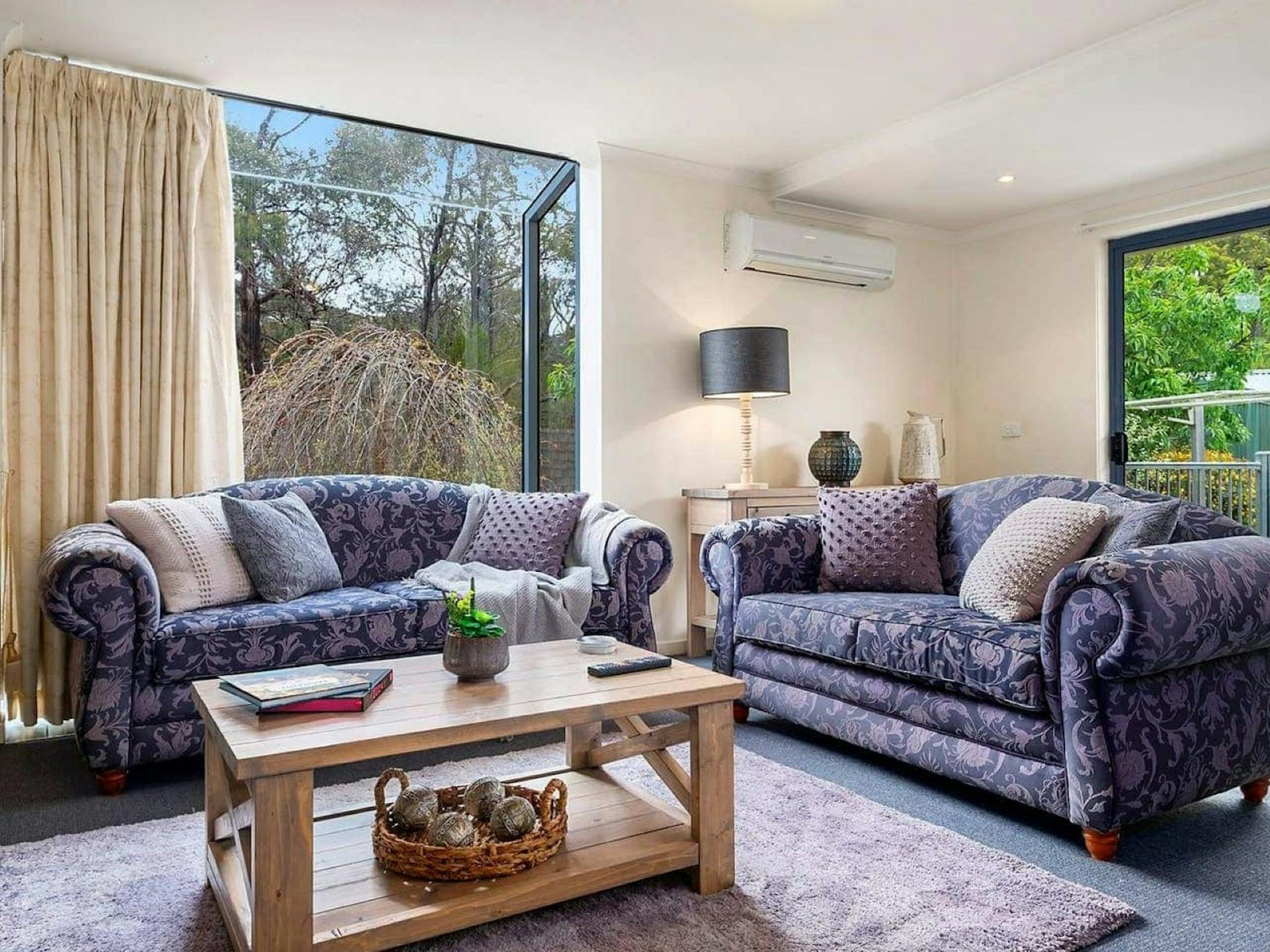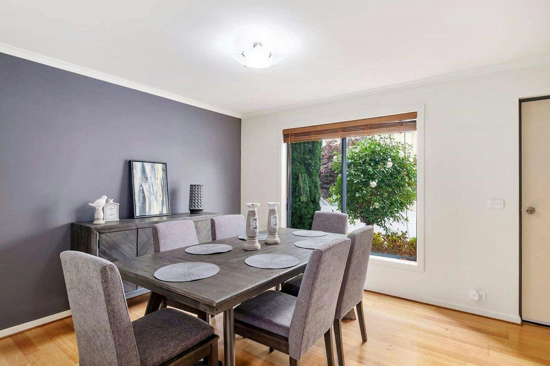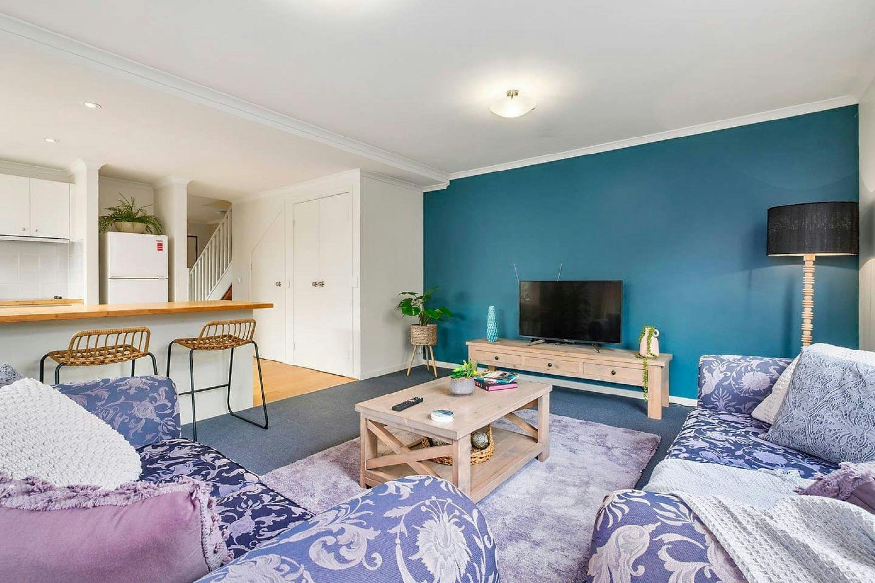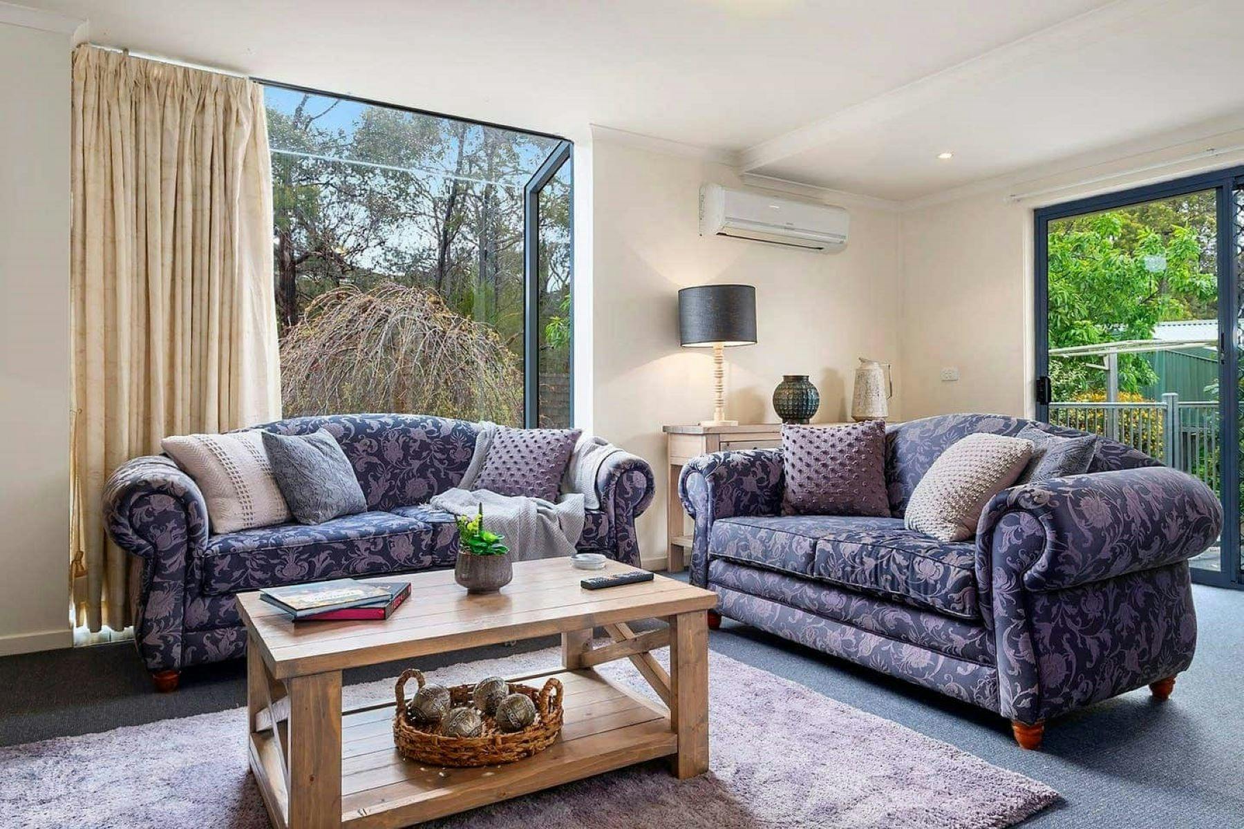 Looking out from the beautifully appointed lounge room through the waterfall bay windows which frames the beautiful rear garden which backs onto a Council reserve. This spacious conjoined two-bedroom townhouse really will surprise you. Relaxing and comfortable living spaces fitted with modern appliances including free Wi-Fi and a coffee machine.