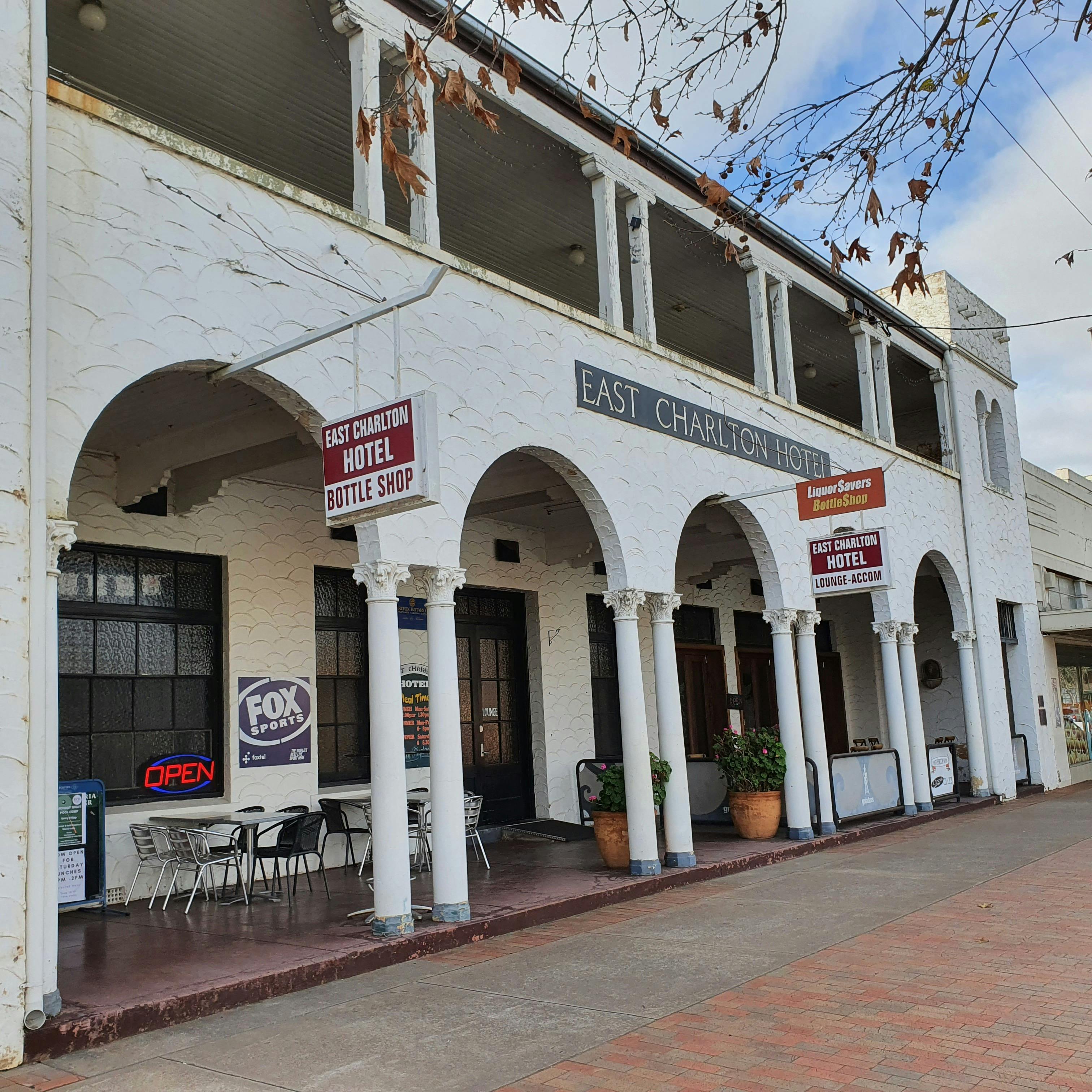 The East Charlton Hotel is perfectly situated in the centre of Charlton on the Calder Highway at the halfway point of Melbourne and Mildura.