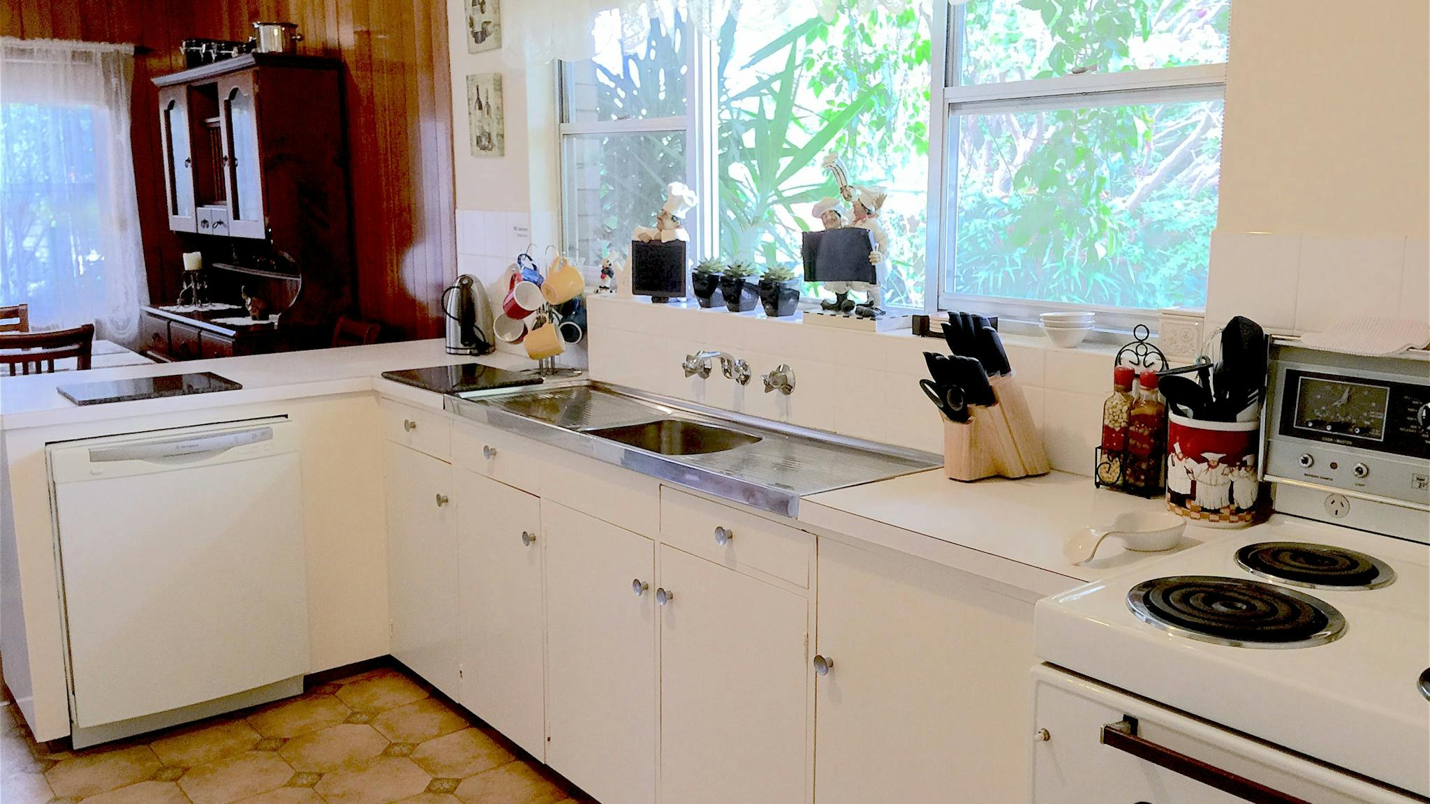 The country style kitchen is fully stocked with dishwasher, electric stove and microwave. coffee, coffee plunger, tea, milk, bread, cereals provided.