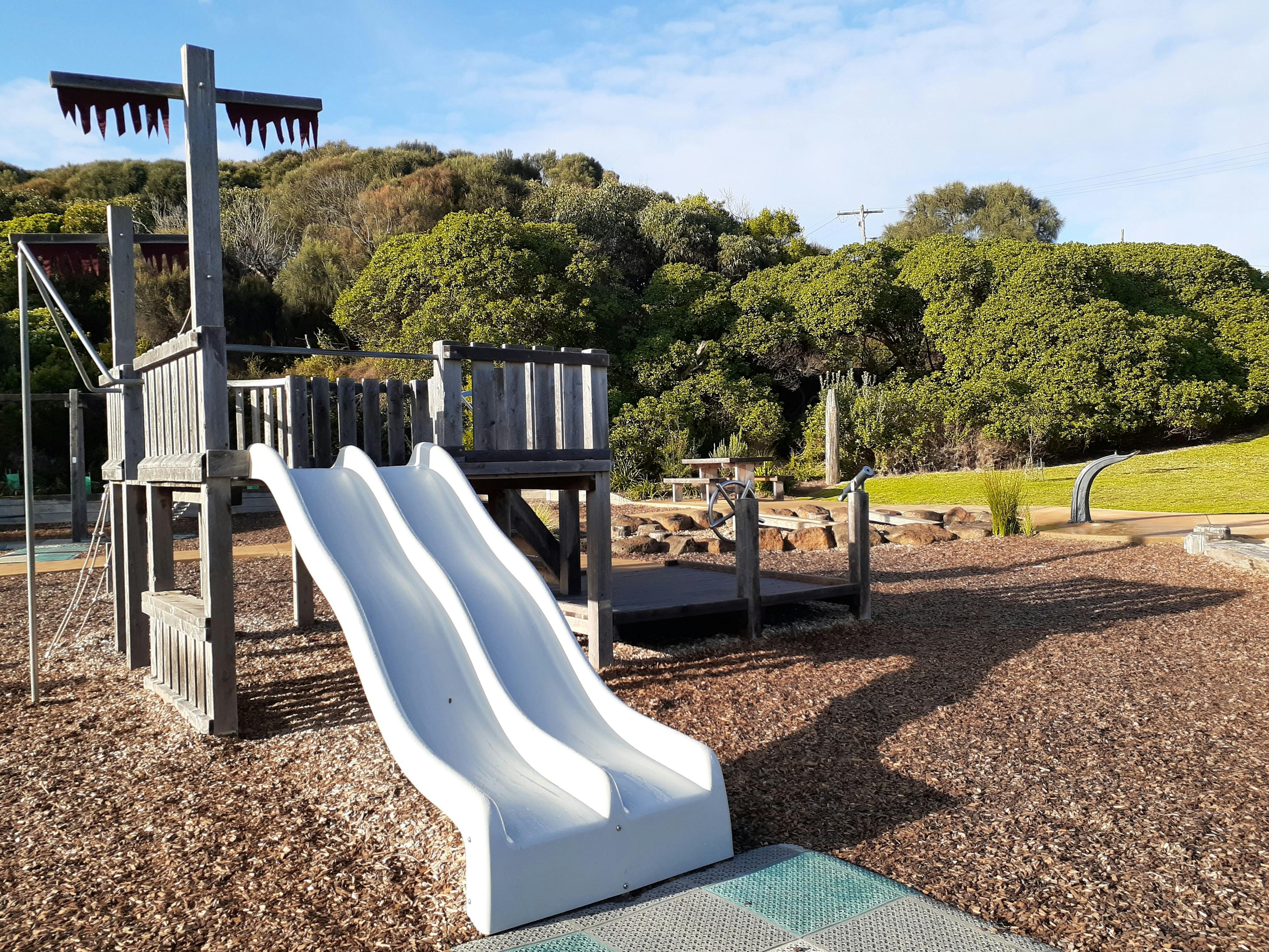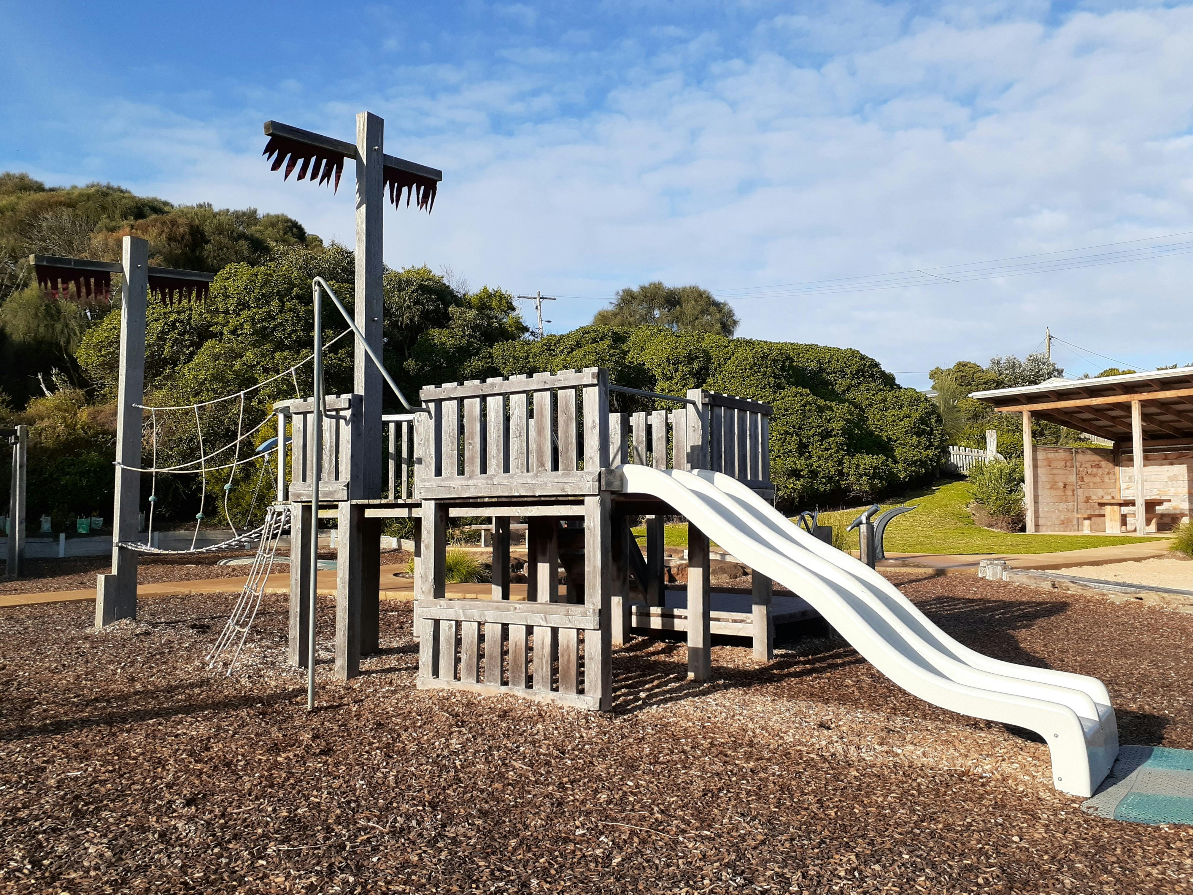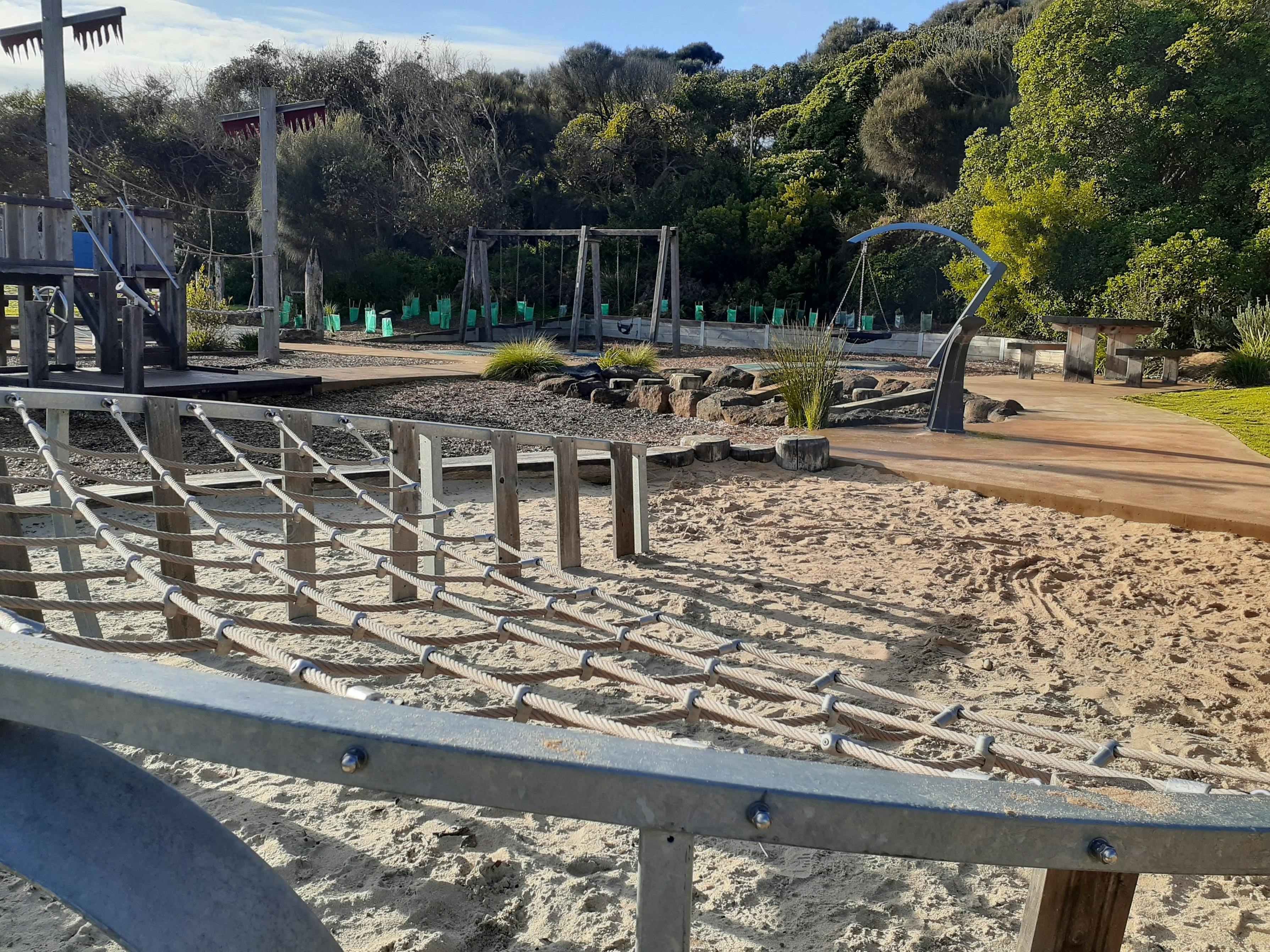 The Port Campbell Playground is a sensory delight for the little people in your life. The main play area is nautical themed and designed with nature in mind. The slides, climbing nets, swings and balance boards are surrounded by sand, rocks, wooden elements and grass.