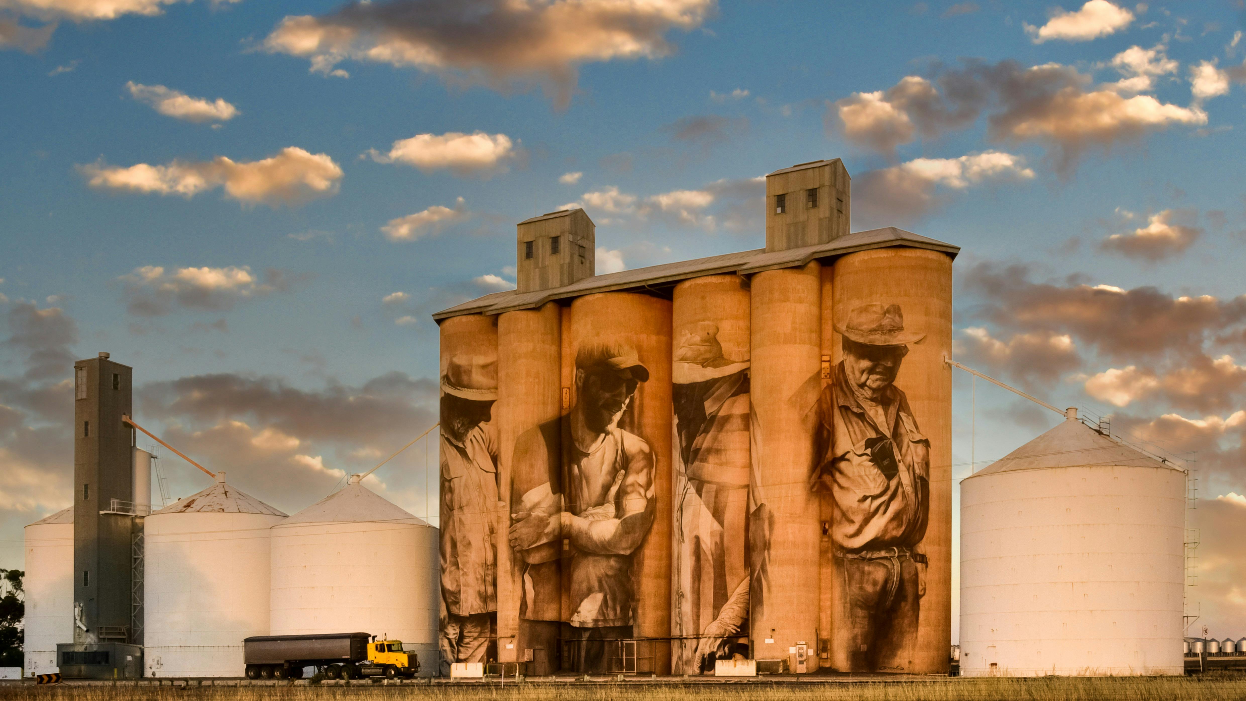 Completed in early 2016, with limited financial resources, van Helten’s mural depicts an anonymous, multi-generational quartet of female and male farmers. Rendered across these four 1939-built GrainCorp silos, van Helten’s subjects bear expressions that exemplify the strength and resilience of the local farming community.