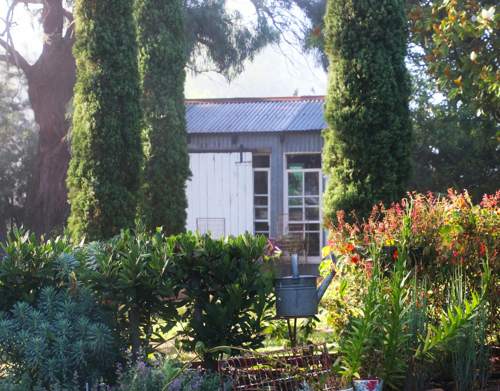 Since its last opening in 2021, new projects have brought fresh energy to the space. The loss of a Grevillea robusta inspired a redesign of the front area, with improved parking, winding paths, and rock walls around the mulberry. A new path behind the fruit tree hedge leads to the chickens, bordered by citrus, natives, and salvias. The long-dreamt-of potting shed, built from reclaimed materials, is finally complete.