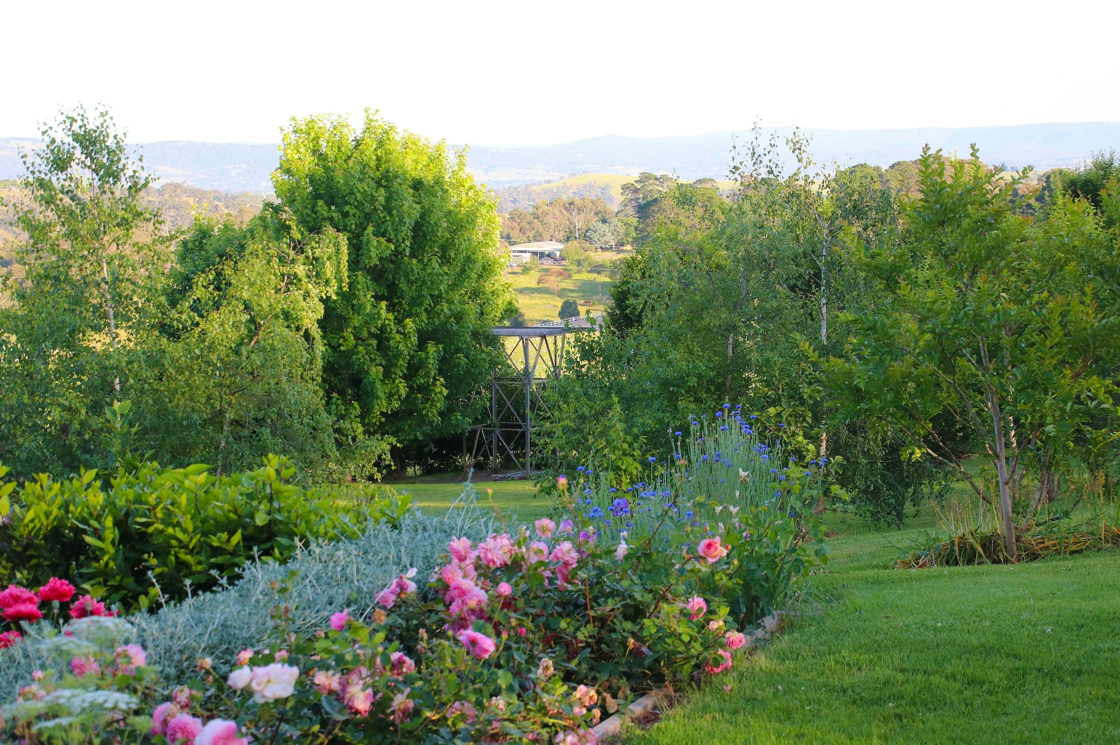 Vintage finds, old outbuildings and upcycled pieces add whimsy to this charming garden, while stunning views across Yarra Glen and the Kinglake Ranges provide a serene backdrop.