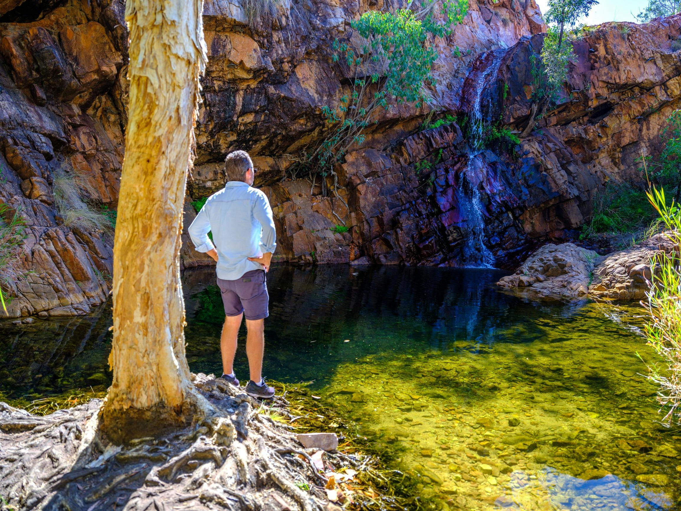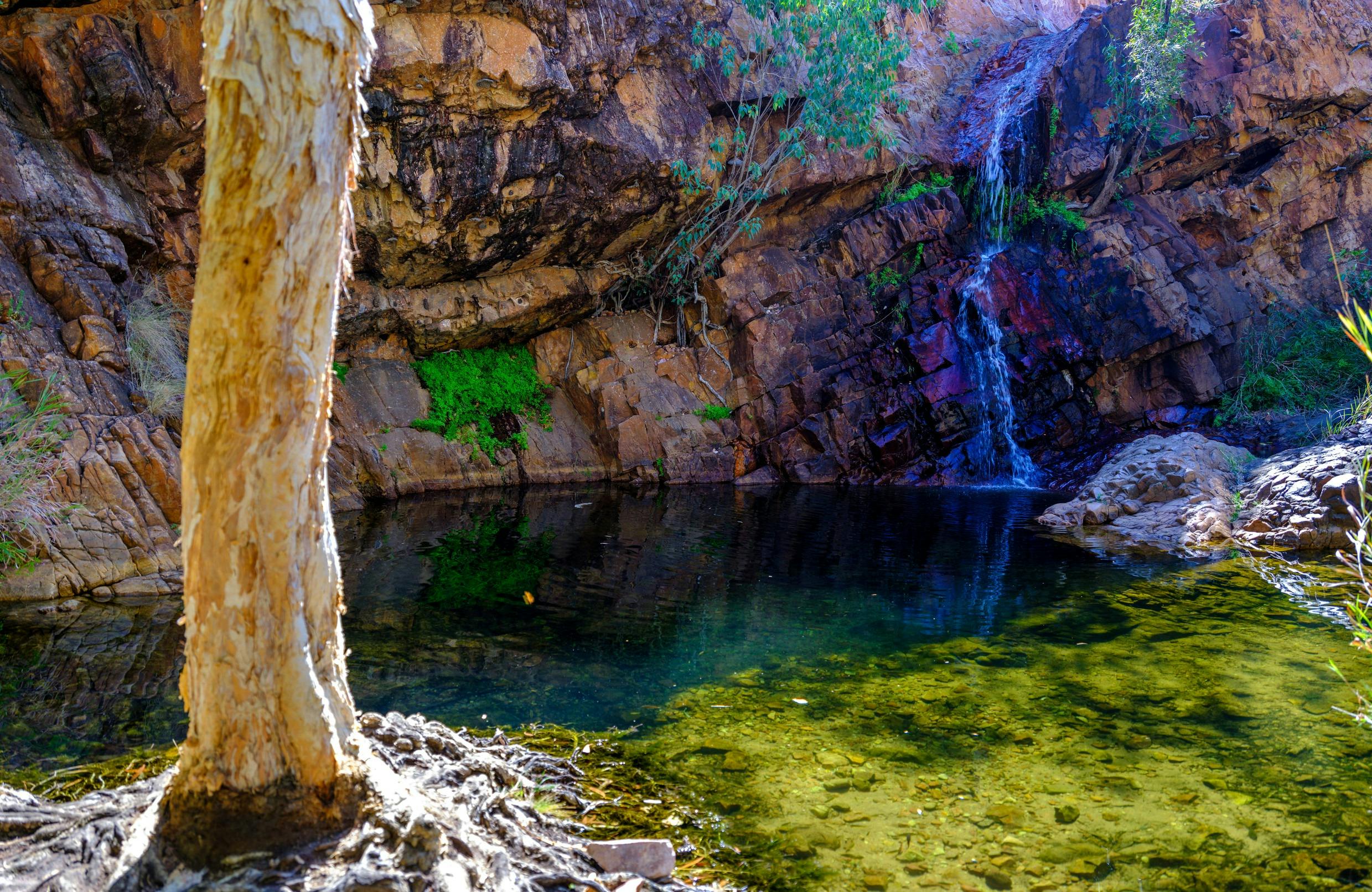 Emphasis should be placed on little here; the pool is only a few metres across so a little cosy sometimes! It is however a lovely shady place to sit in the water and watch the fish, goannas and birds. This little Kununurra waterfall is very popular with the locals and its available to access all year round.