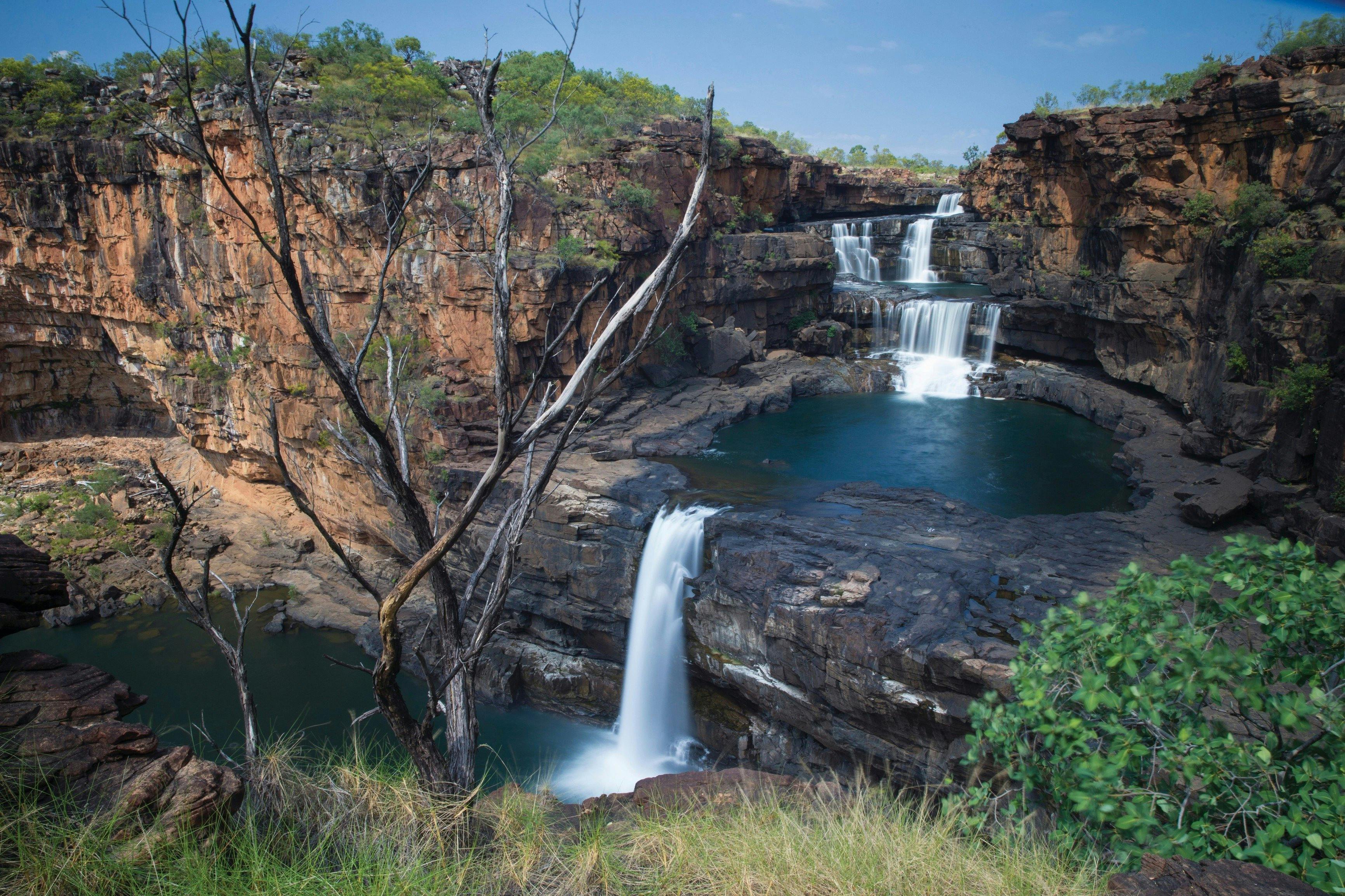 Mitchell Plateau is a true wilderness adventure with jaw-dropping panoramas of wild escarpments, tropical rainforests and the thundering four-tiered falls known as Mitchell Falls - reached via the Mitchell Plateau and a six-kilometre hike from the camping ground. Extend your adventure, by following the trail to Little Mertens Falls and Big Mertens Falls.
