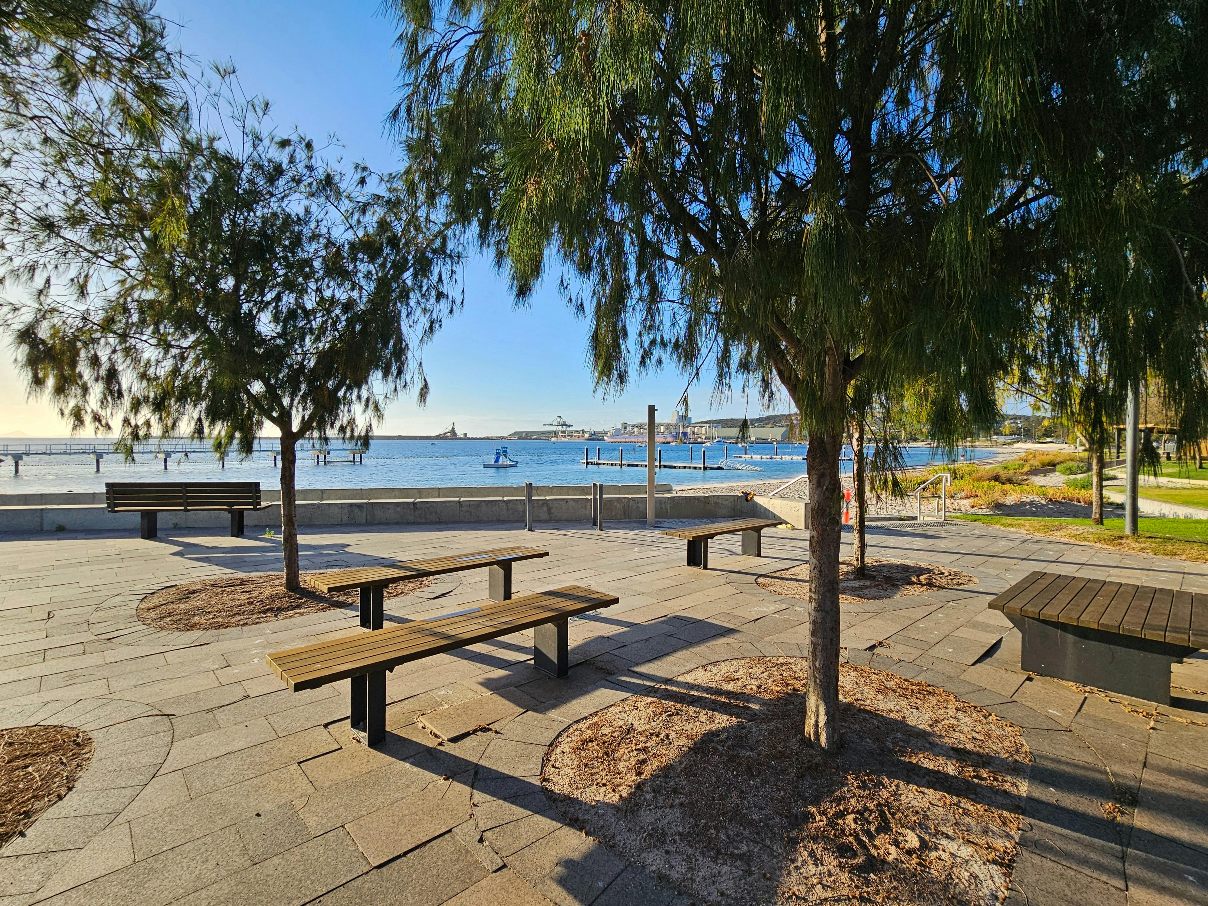 This beach is ideal for families. Not only for the protected swimming area and calm bay, but there is a playground, toilet and shower facilities and a long stretch of green grass along the foreshore.
