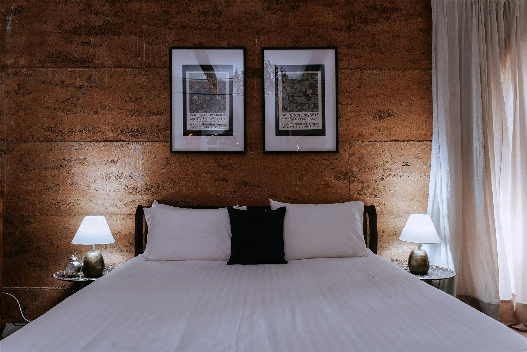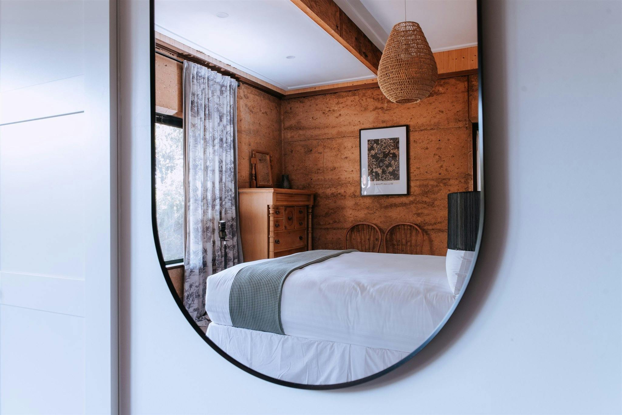 The double-storey rammed earth property has been uniquely styled; with many of the furnishings hand-made by the owner, re-purposed or antique. The main living area, upstairs, is a stunning open-plan space, with a vaulted ceiling. It opens onto a wraparound deck, with views across the garden and into the trees.