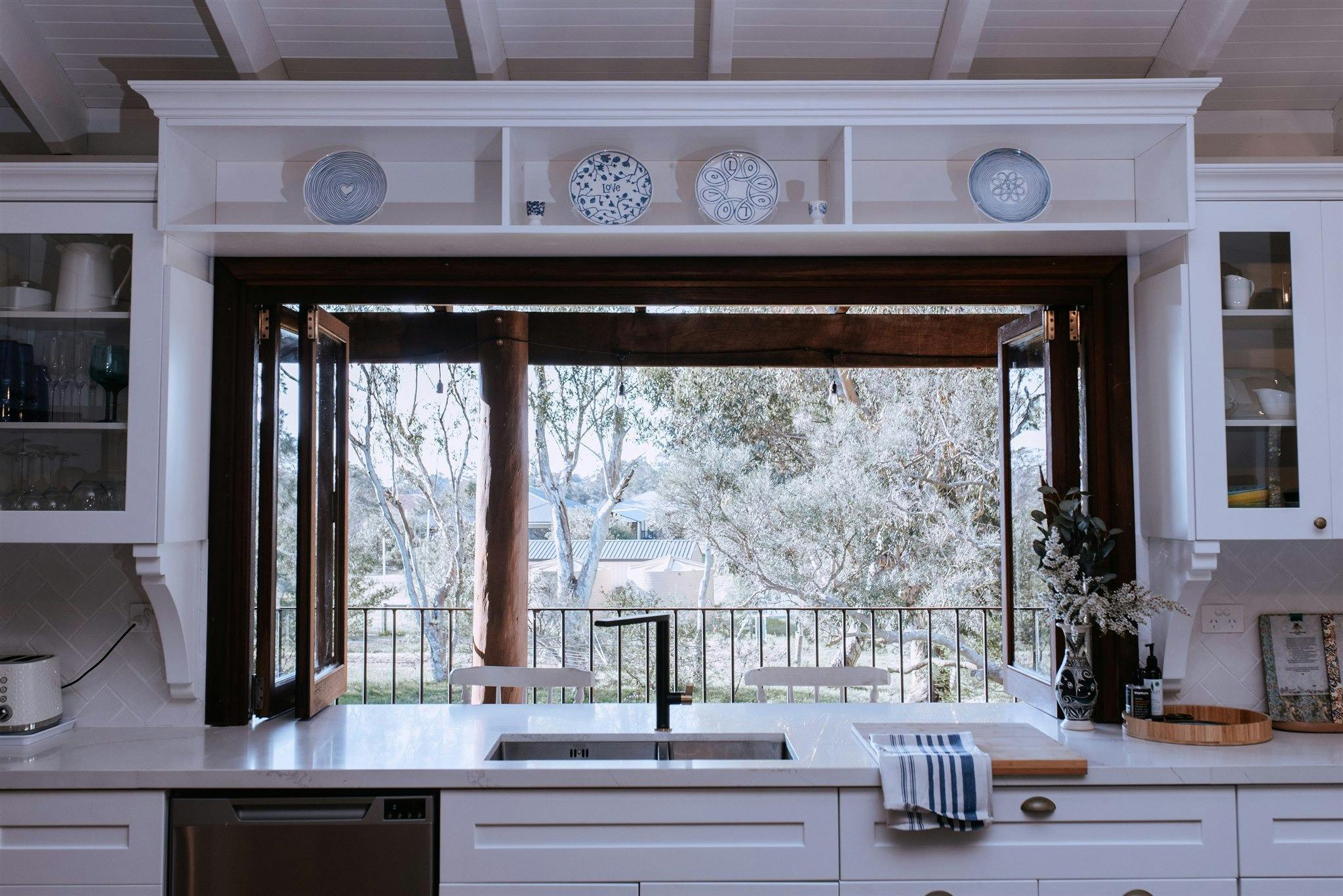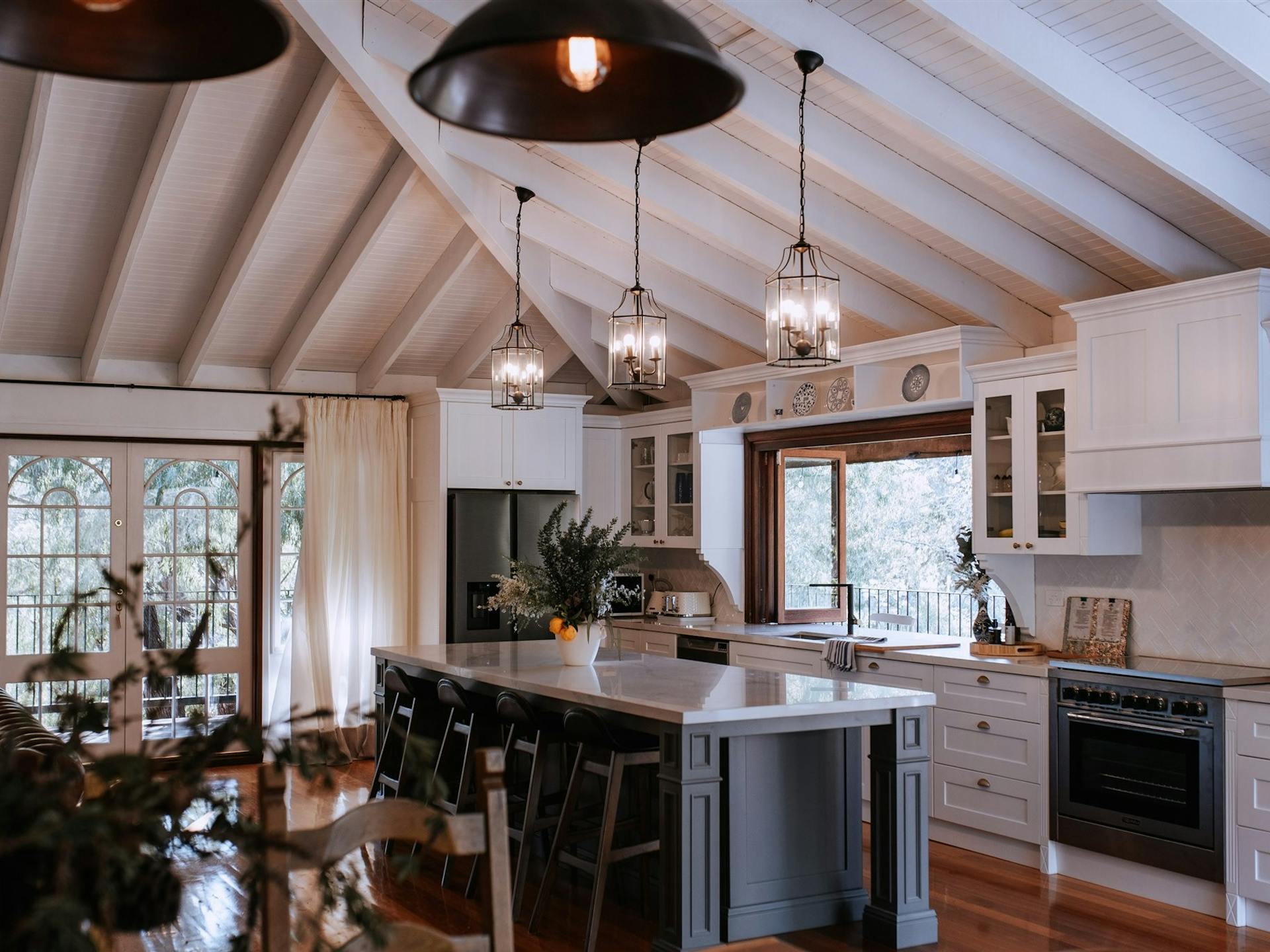 The renovated bespoke kitchen offers a luxurious space to entertain. The large main bathroom has a freestanding bath facing the garden, crowned by a crystal chandelier above. There are four eclectically styled bedrooms, all with hotel-quality mattresses and toppers. The bedroom upstairs has an ensuite bathroom and opens onto the deck outside. You’ll find both quiet nooks and room to socialise here.