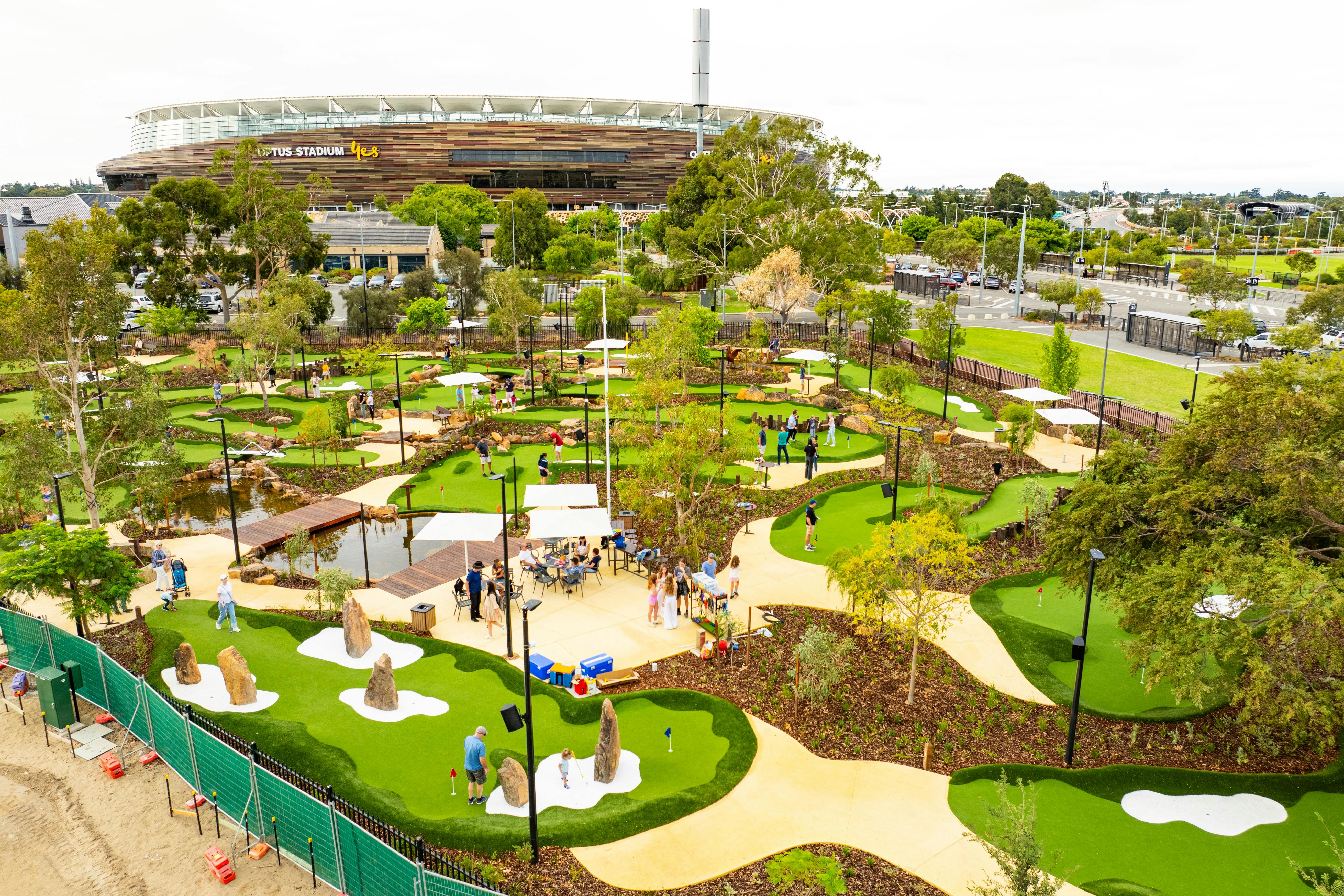 Matagarup Mini Golf is Perth’s biggest and best course with West Australian-inspired 18-holes set amongst native landscaping, a 50-metre creek, artwork and leafy trees.