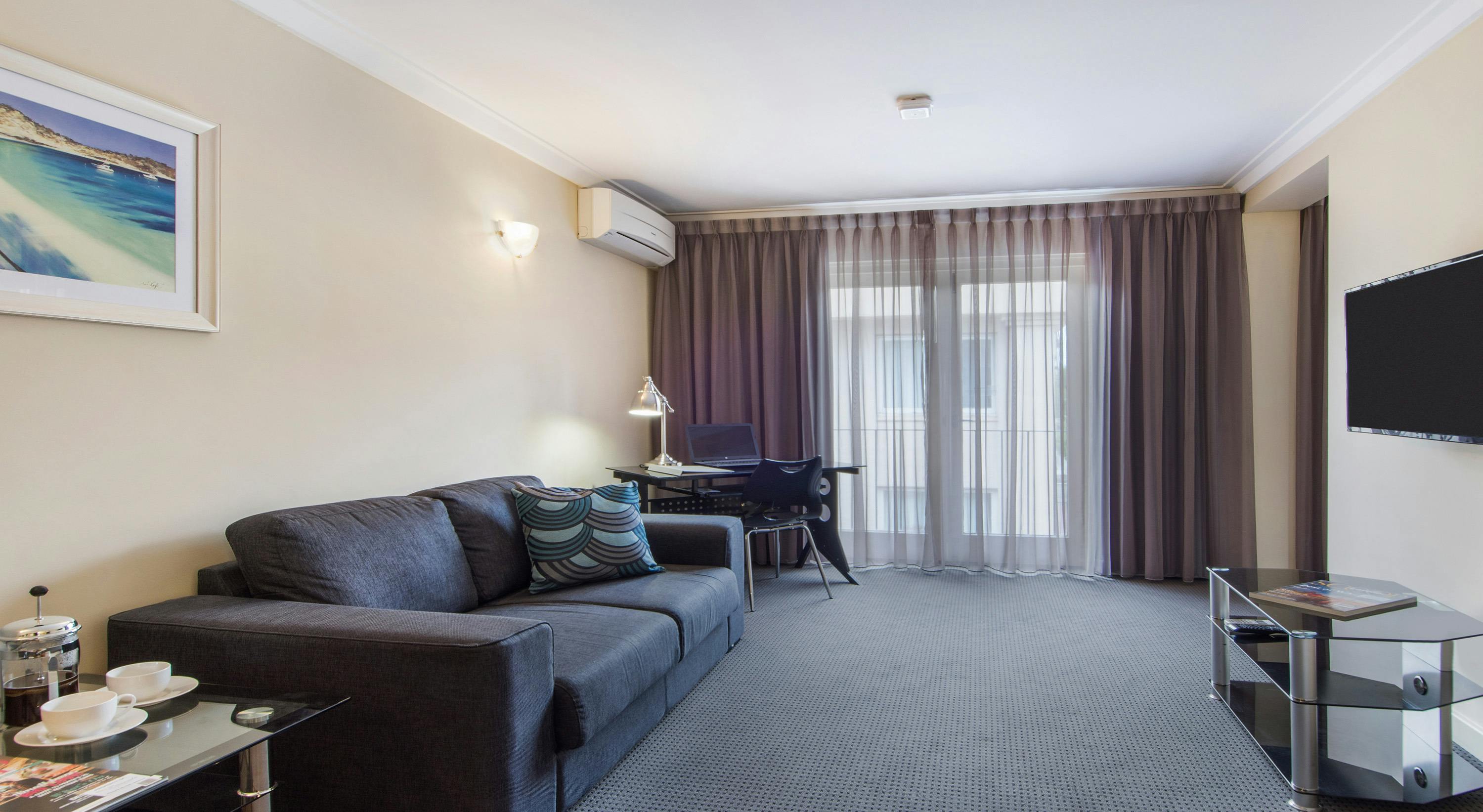 The apartments are fully equipped and serviced daily (excluding Sundays and Public Holidays). Reception is open 24 hours, 7 days a week. Guest services include free car parking, on-site laundry, grocery delivery service, luggage storage and reception services. High-speed wireless broadband access is available to all apartments, free of charge. There is a guest lounge that has a full bathroom for early arrivals or late departures.